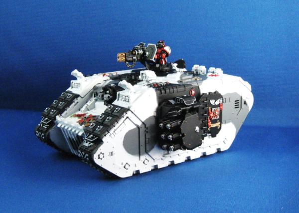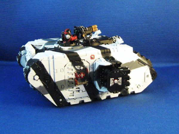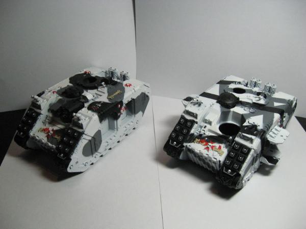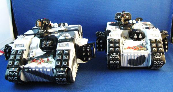Below is a WIP picture I took of my 2 land raiders. I wanted to do a Winter Camo paint job on these, and tried 2 different method.