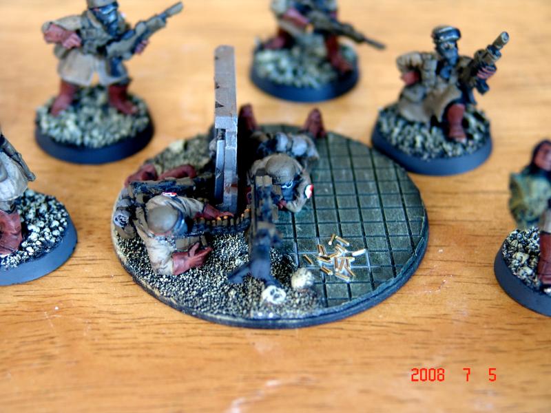 I don't have any pics of anything, sorry  There are two things I feel I must say though. The first is an idea that I've seen pulled off by several people. I've always thought it would be cool to make an IG army with all wheeled light vehicles, such as having an armored car or dune buggy stand in for a sentinel, a wheeled troop transport as a chimera etc etc. The french even made something like a wheeled tank that could be used as a russ The second thing is that those kilt guardsmen are awesome! How exactly did you go about doing that?