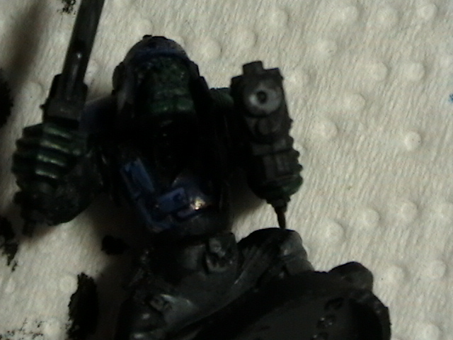 Have you washed the armor at all? I always wash Ork armor with watered down orange paint, it nicely gives the illusion of rust. As for battle damage, my suggestion would be to paint bits with tin bitz, and then layer that with chainmail, leaving some tin bitz showing. Its quite effective, especially when you chip some of the armor before the rust wash, it kind of gives the look that it was damaged at an earlier time and never fixed