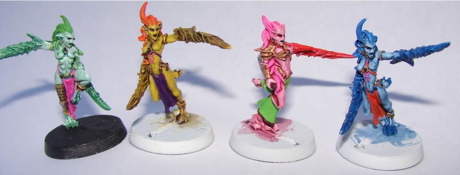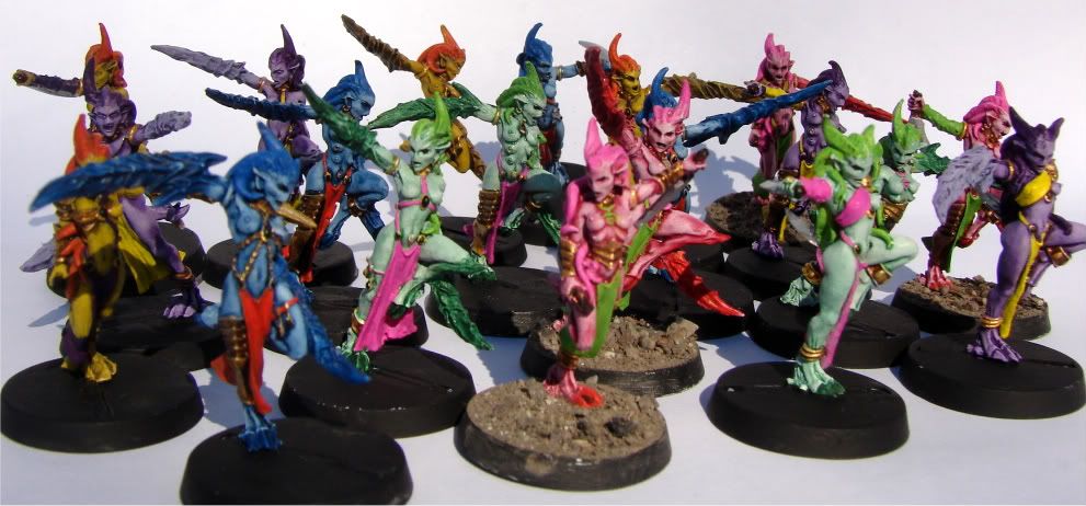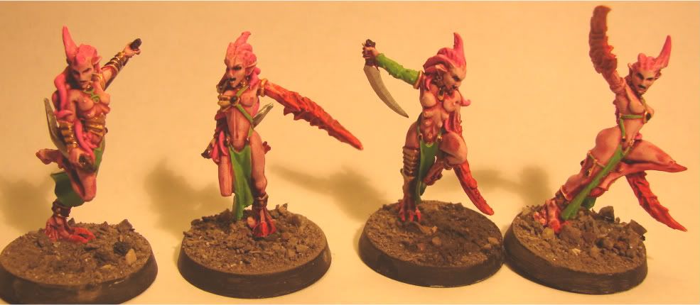 I have a squad of 20 of them. Couldn't decide on a single paint scheme so I decided to do 5 different colors, 4 of each. The pic only shows the skin tone, hair color, and cloth color. All the metal will be burnished gold with a tin bits wash. gems being a gloss black. and the claws a darker tone of the skin color. Just throwing these up as they are to get a little feed back on the progress. Should have all 20 of them painted and based by next week I hope.