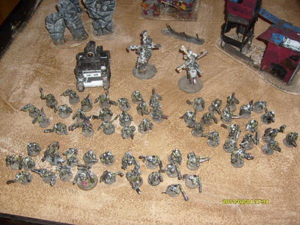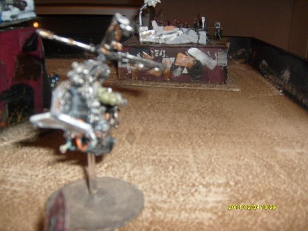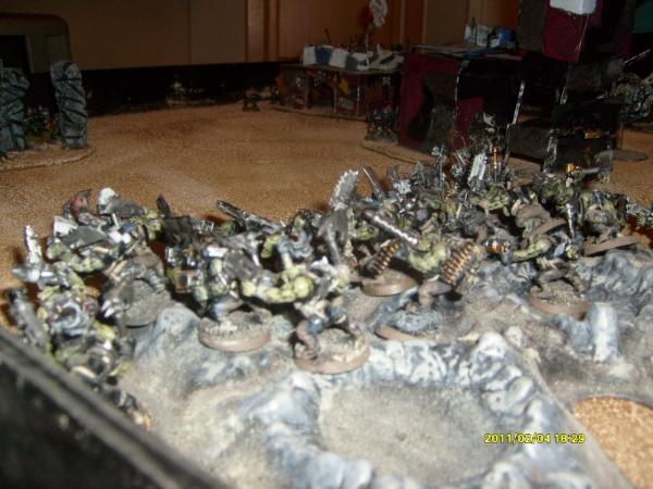The terminators fight on but the orks are too many, they get destroyed. The mob then consoldatees towards the dreadnought to help the other greenskins. The dreadnought kills another boy but they pass the morale test.