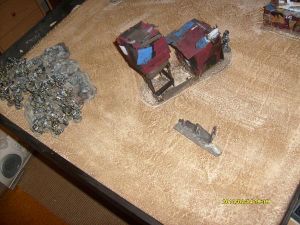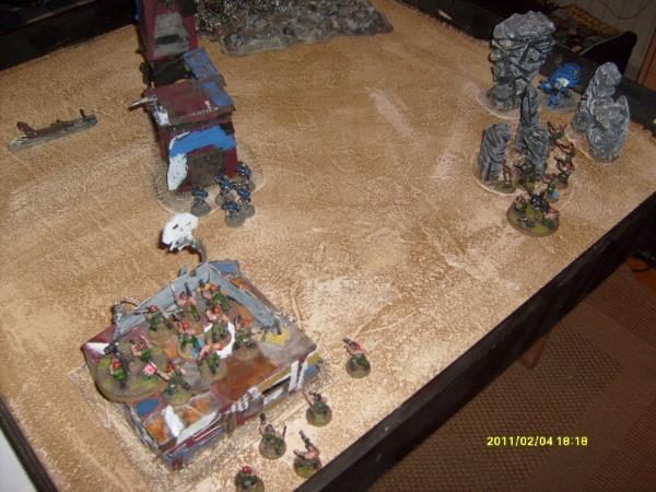One mob assaulted the dreadnought but didn’t do any damage, the dread then struck back and crushed the leg of the nob and wounding him. The right mob tried to assault the bunker but was out of range, lastly the deffkopta destroyed the building with its buzzaw. Two guardsmen in the command squad were caught in the blast and they fled off the table one space marine and 4 guardsmen from the infantry squad also died.