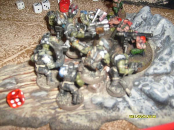 The infantry squad gets slaughtered after killing 3 boyz. The mob then consolidates towards the other infantry squad