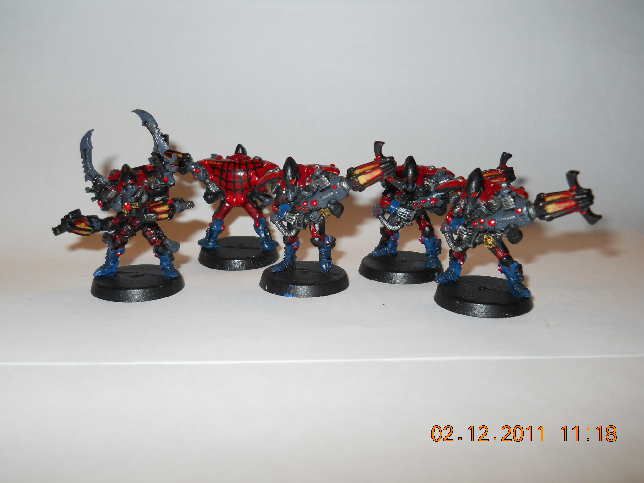 This weekend was the weekend to finish my Warp Spider unit. I took a cue from Spiderman - couldn't help it! Used an ink pen to do the web pattern on the backs, then had to varnish it because it turns out the pen ink bleeds (BIG mistake to find out, but fortunately I only had to redo ONE of the Spiders)! I have a feeling I'm going to take a lot of ribbing about the paint job on these guys. I'm currently working on my Dire Avengers, and hope to have one of the units finished either tomorrow or next weekend - will post the pics then!