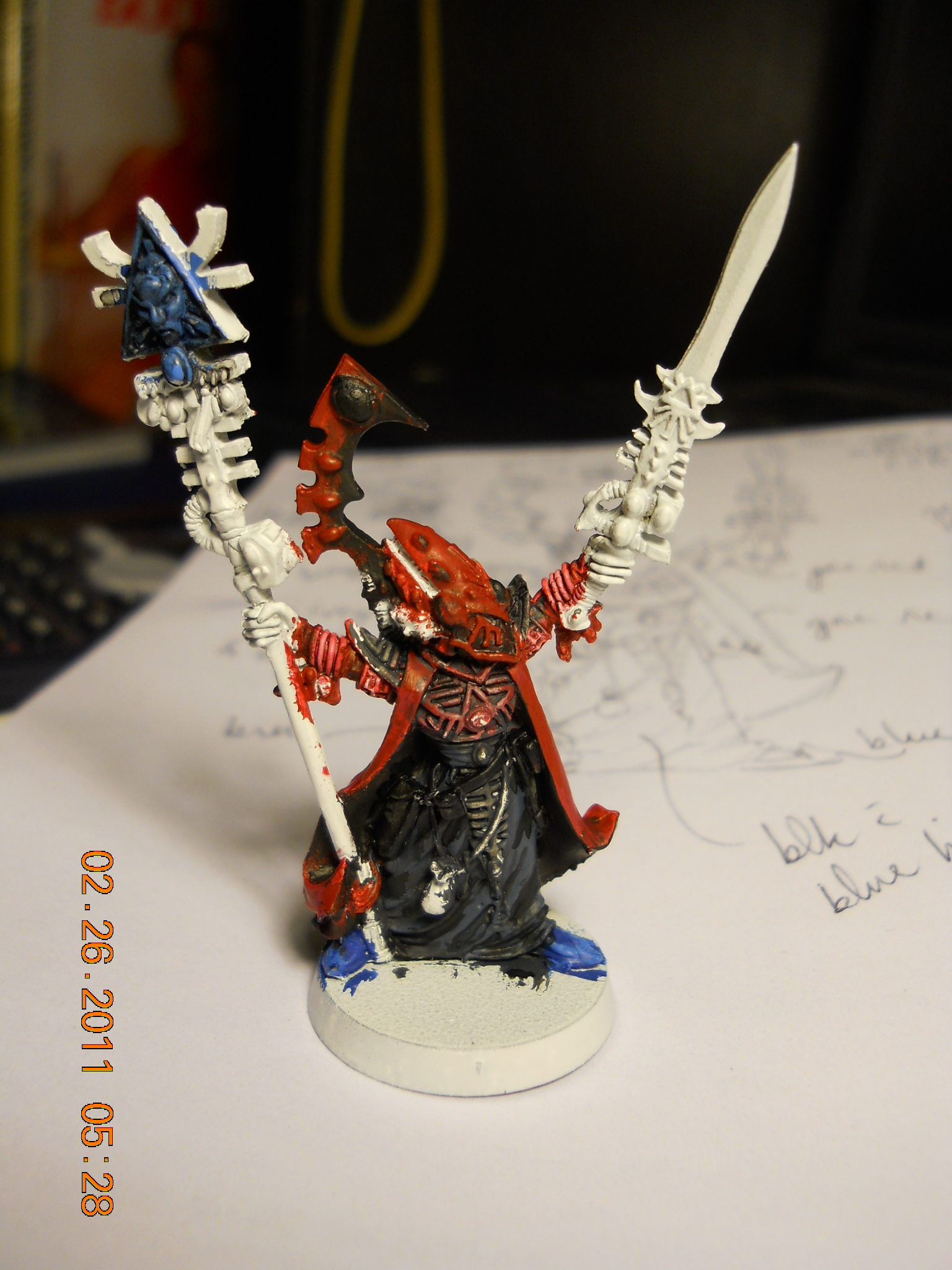 OK, so now I need input from everyone out there. I've been told that my Eldrad doesn't look "Ulthwe enough" because I used too much of the dark red. Do I need to redo his cloak and make it black in order to keep to the true color palette, or can I leave the cloak dark red? Same problem with the Farseer. Help!
