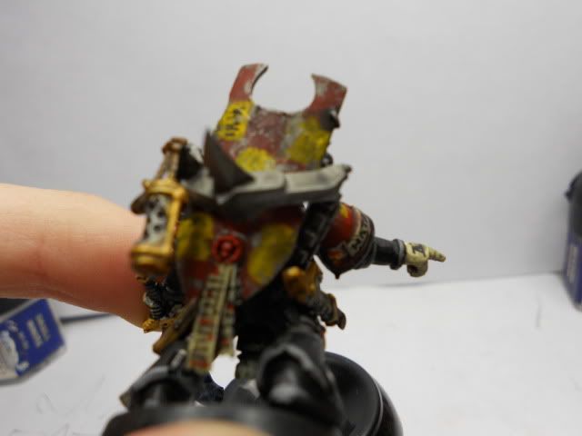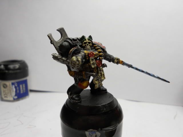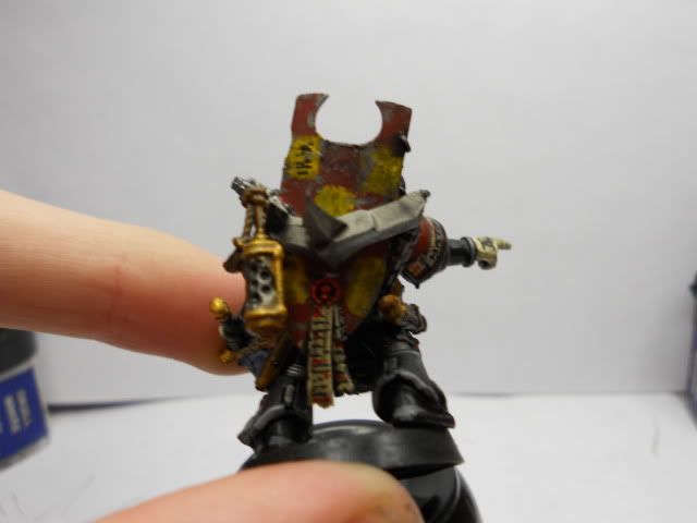 Today I was, yet again, putting off on painting my Badab war mini-project (don't blame me! only the quartered/halves schemes are left! ((well, and the Red Scorpion....)) ) so I threw this guy together. He started as a Chaplain that I received as part of the trade. While looking at him for a while, I decided to removed his arms and rotate the head, starting all over. Everything minus the legs, torso, pack and head are new. I wanted a very crusader aspect to him, so I put a shield on his back. I didn't have long enough chain (its from the ork wrekker ball) so I used a part from an ork loota to make the section holding his shield on his back.