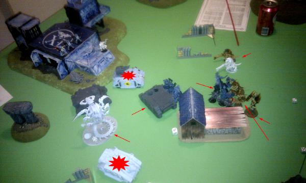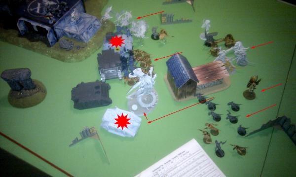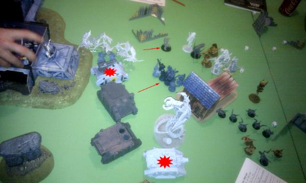 Hive Guard shoot and kill the Lone Wolf, whilst the left flank Zoey moves towards the centre and blasts two marines (again nullify fails). The Trygon advances and shoots the
