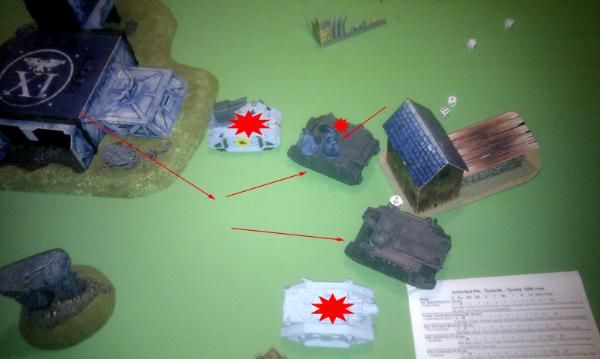 Unfortunately I didn't get a photo of the deployment. I was surprised to see the Space wolves deploy forward. This was probably because he chose the quarter with the firebase, and only realised after he started deploying that to line all his tanks up in a row he would have to deploy in front of the firebase. His Vindicator deployed off to the far left behind a house, and his two rhinos deployed in the middle in front of the firebase with the Razorback on the far right. His