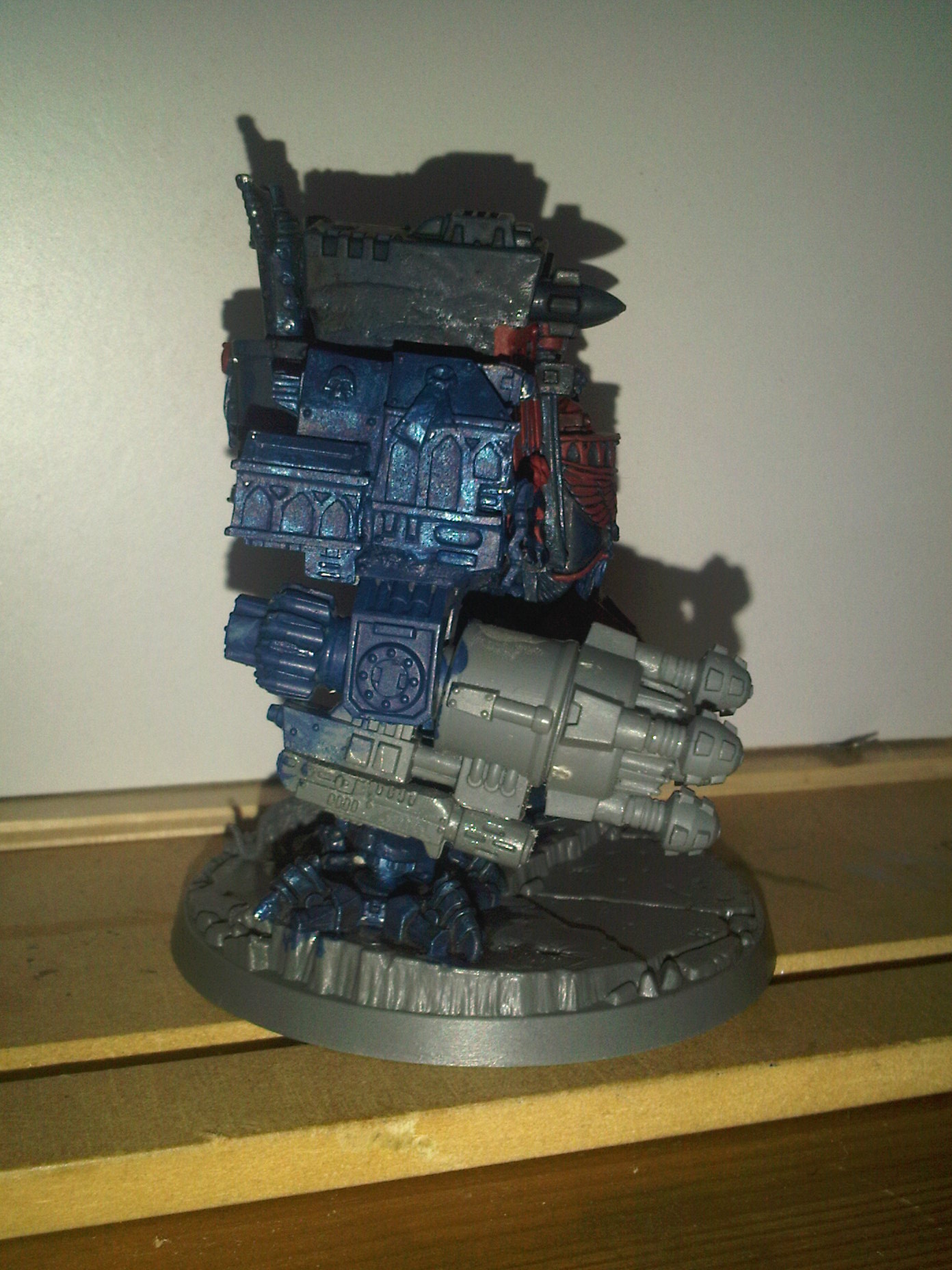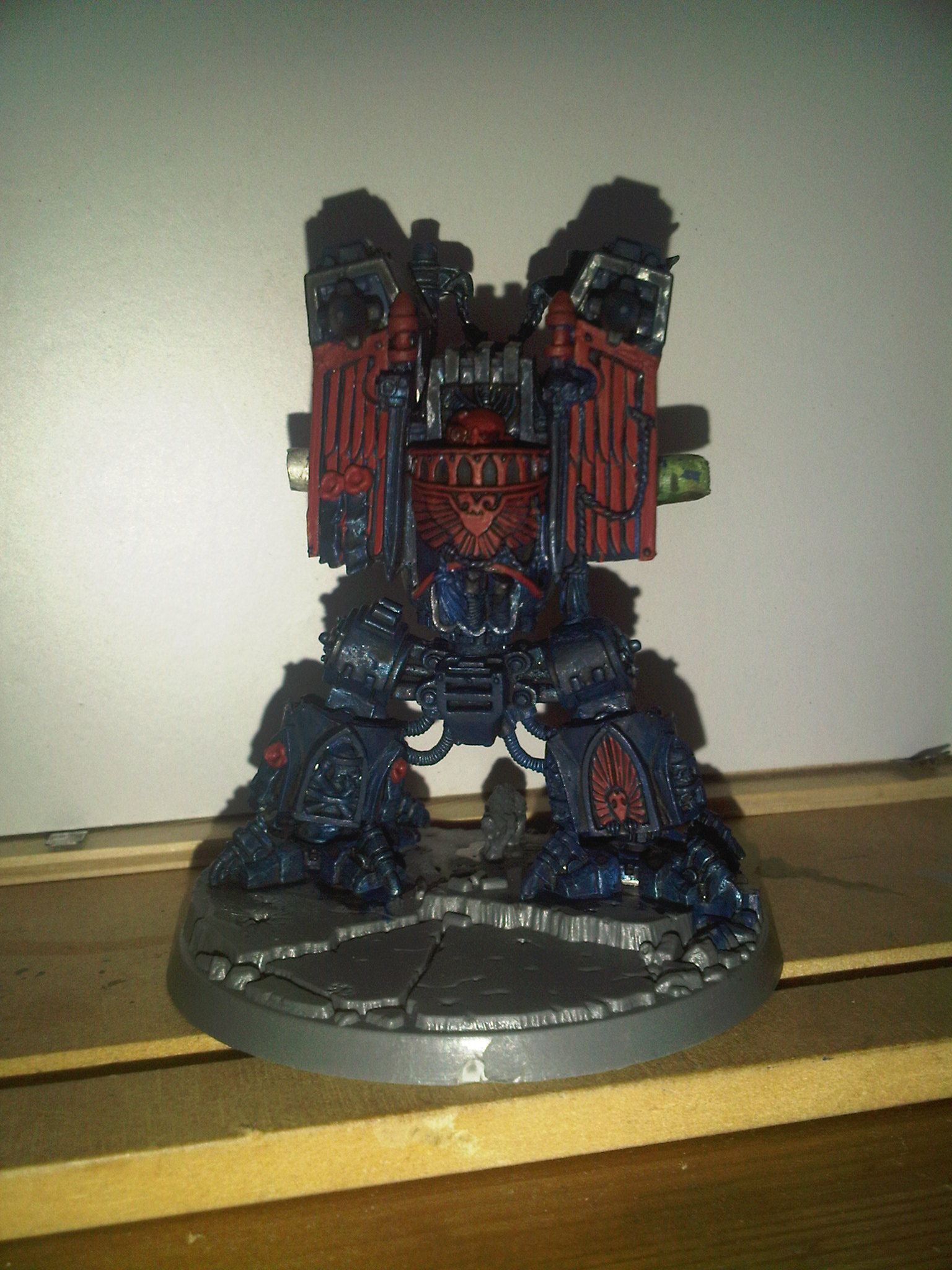 i have a few undercoated models so far but the one i got sidetracked with was an ebay purchase, so i'd like to introduce to you Brother Cadminius my first crimson fist Dreadnought. He is a Venerable Ironclad, points wise i just add 60 pts to standard ironclad as thats the difference for the normal ones.