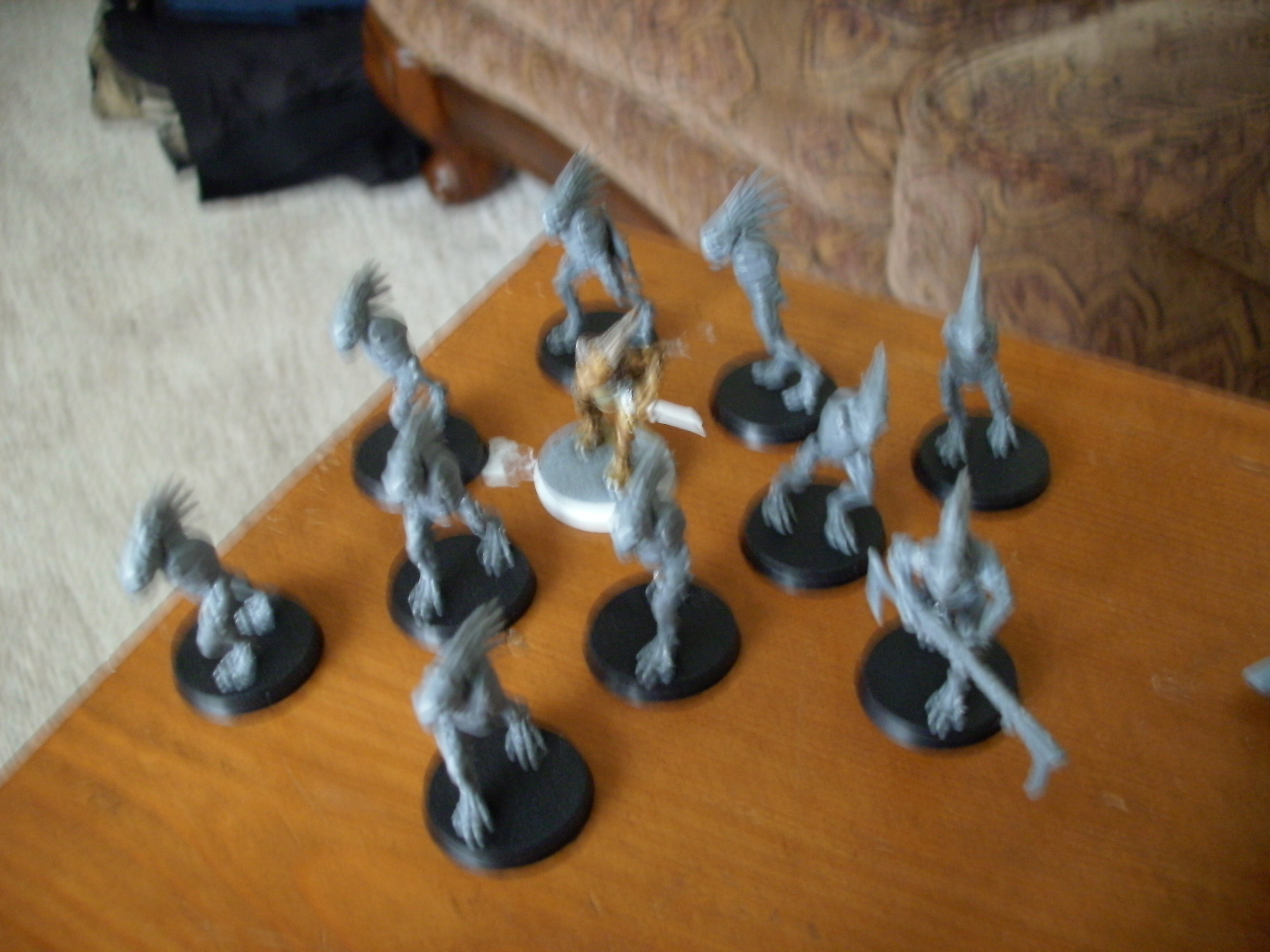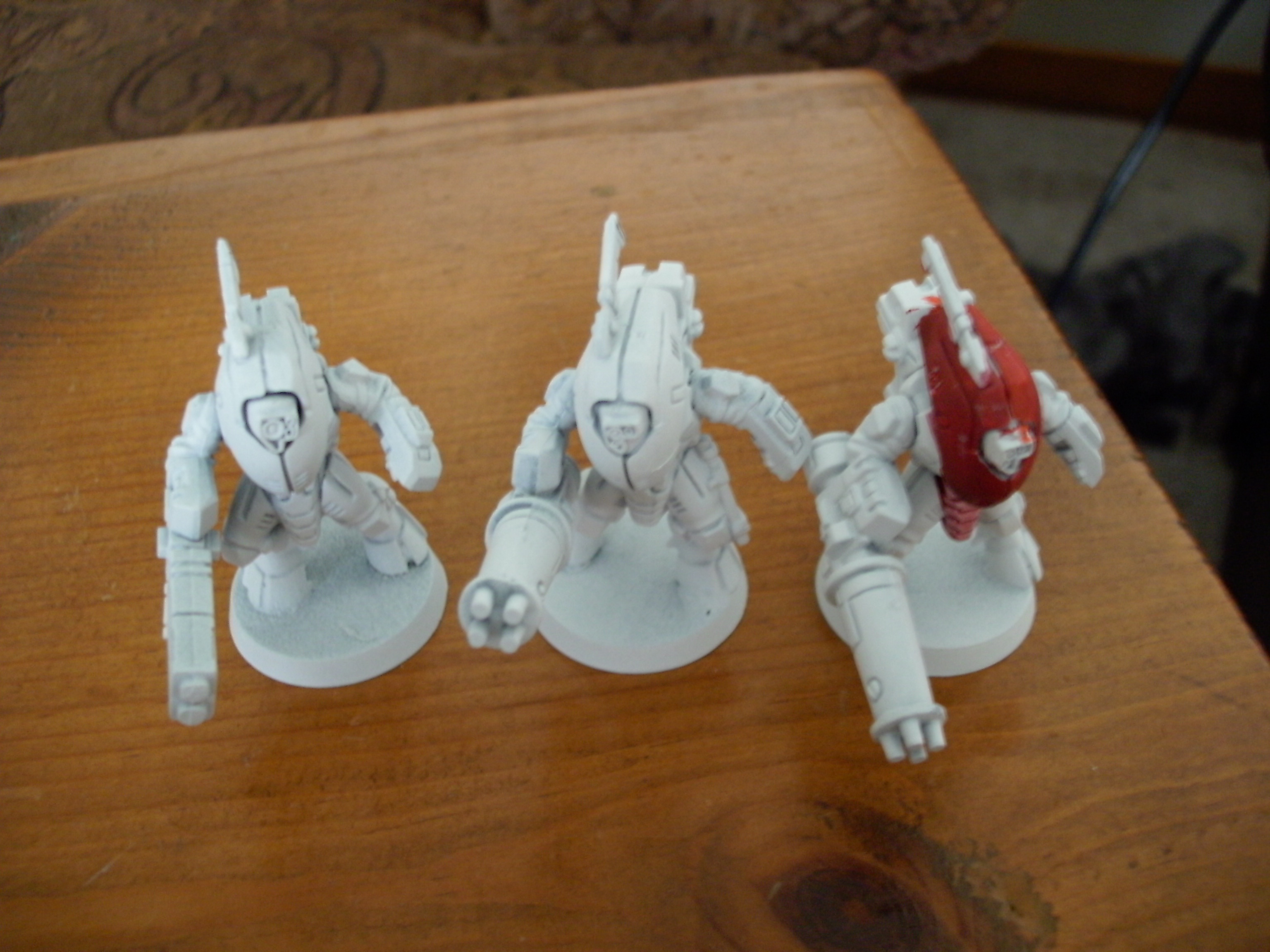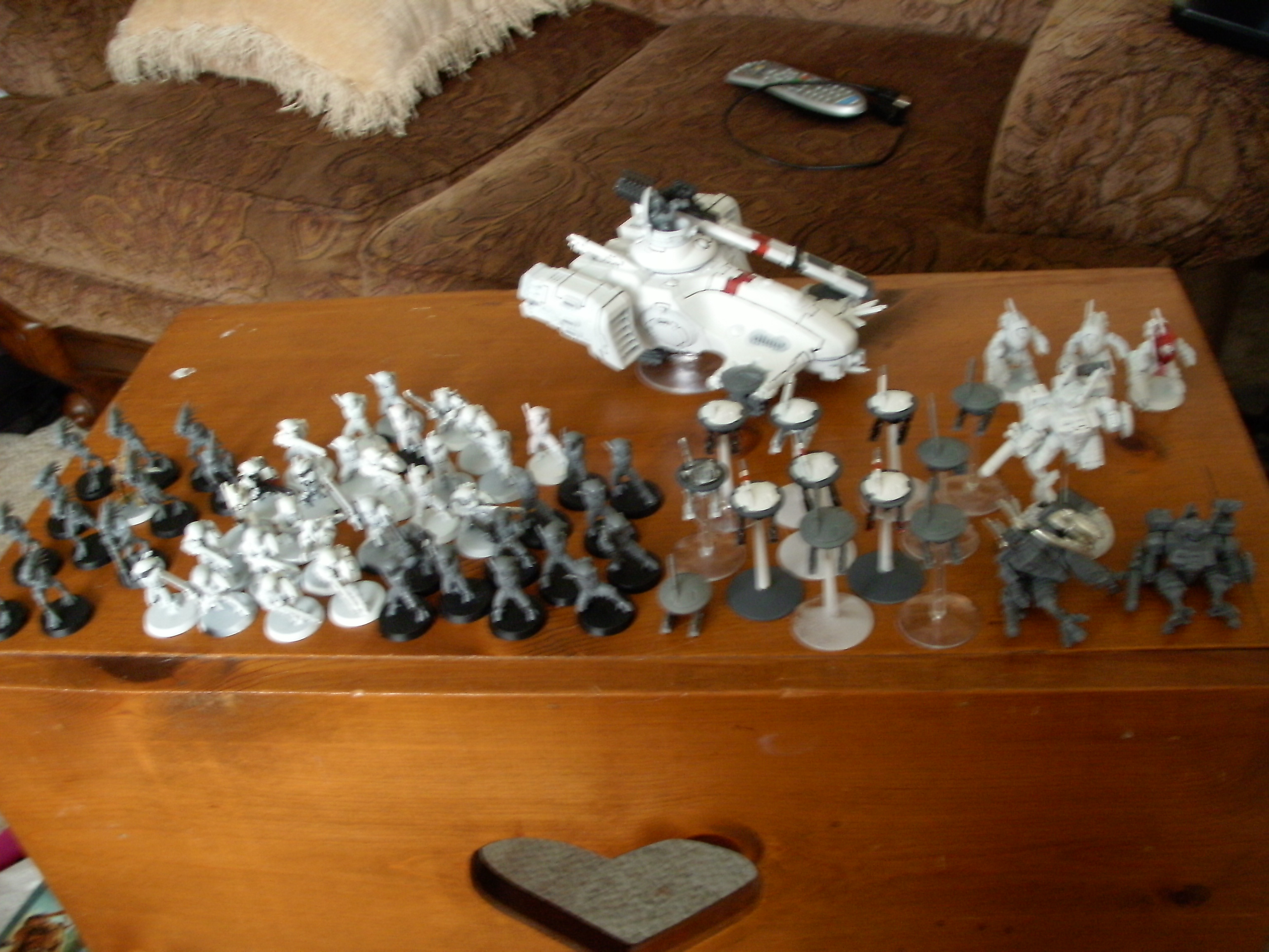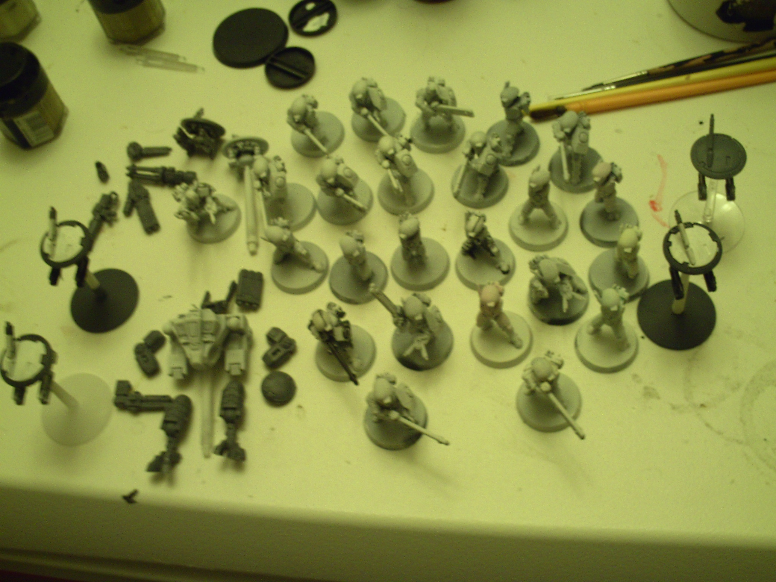 I use to be a Tyranid player but decided that I wanted to do something different. In come the Tau! I am off to a good start with 24 fire warriors and 4 gun drones. Still in the paint testing phase with them, but I think that I am going with a winter them to start off with. Solid colors at first with nothing to fancy till I get use to painting and get the time to pester a really good painter.