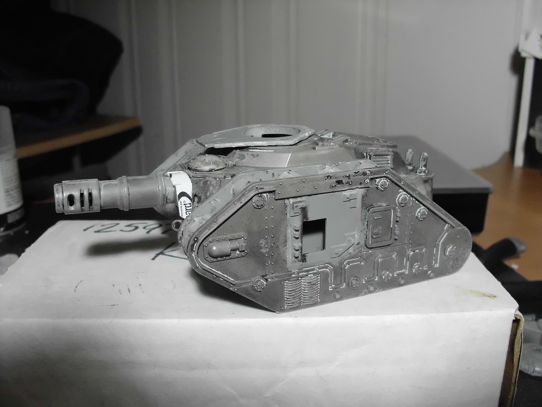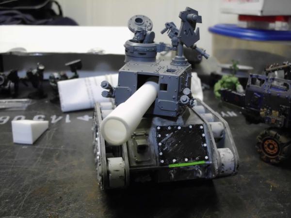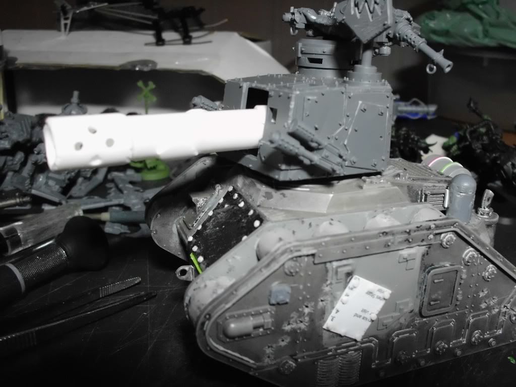 Something I got in the mail yesterday...it was primed with an off spraypaint...so I stripped it down, tore off the treads (going to order those spikey ones from ebay) and pretty much killed the turret to get that bottom piece so I can rig up a platform with the kill kannon from the battlewagon upgrade sprue so I can make a looted wagon, suppose it doesn't need a second cannon on it...but it's more orky that way...the side sponsons are also there, I poped them off...cause what I soaked the tank it breaks down superglue...the treads were a pain as well, but I can use the treads on my tankhuntas...maybe they took out this tank...who knows, but the extra tread would look cool if I can find a way to stick them onto them