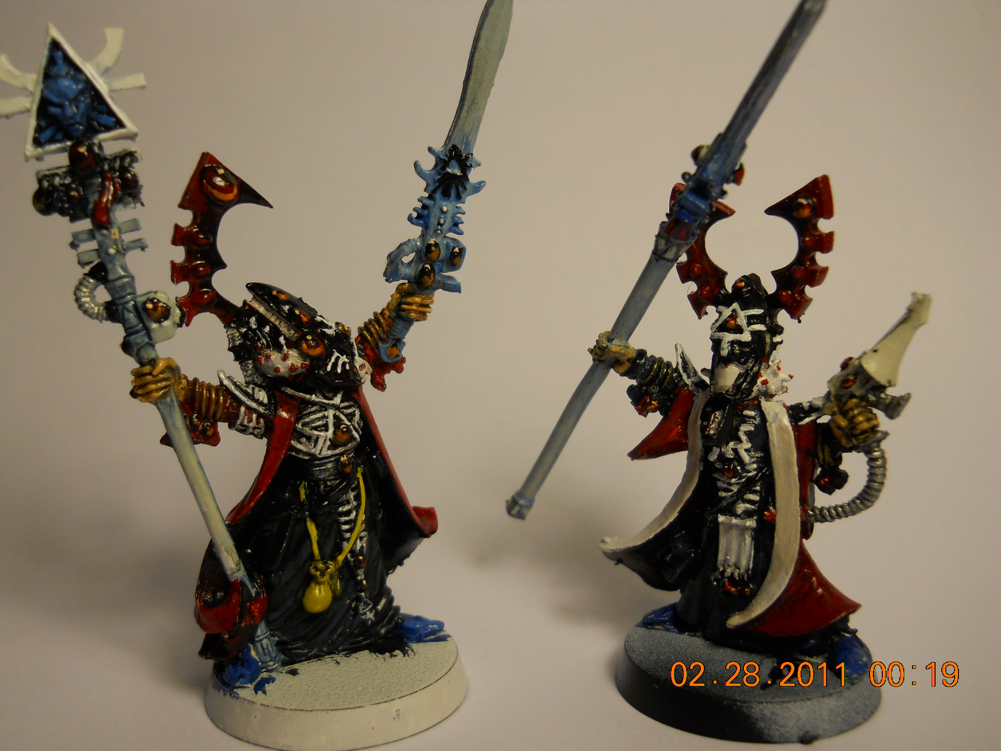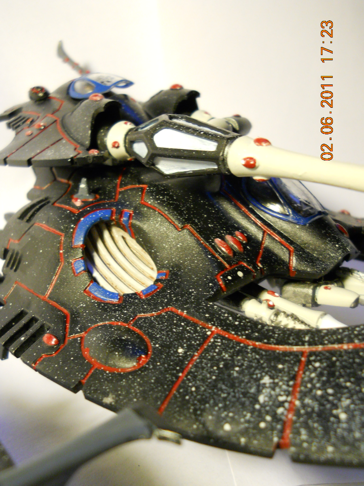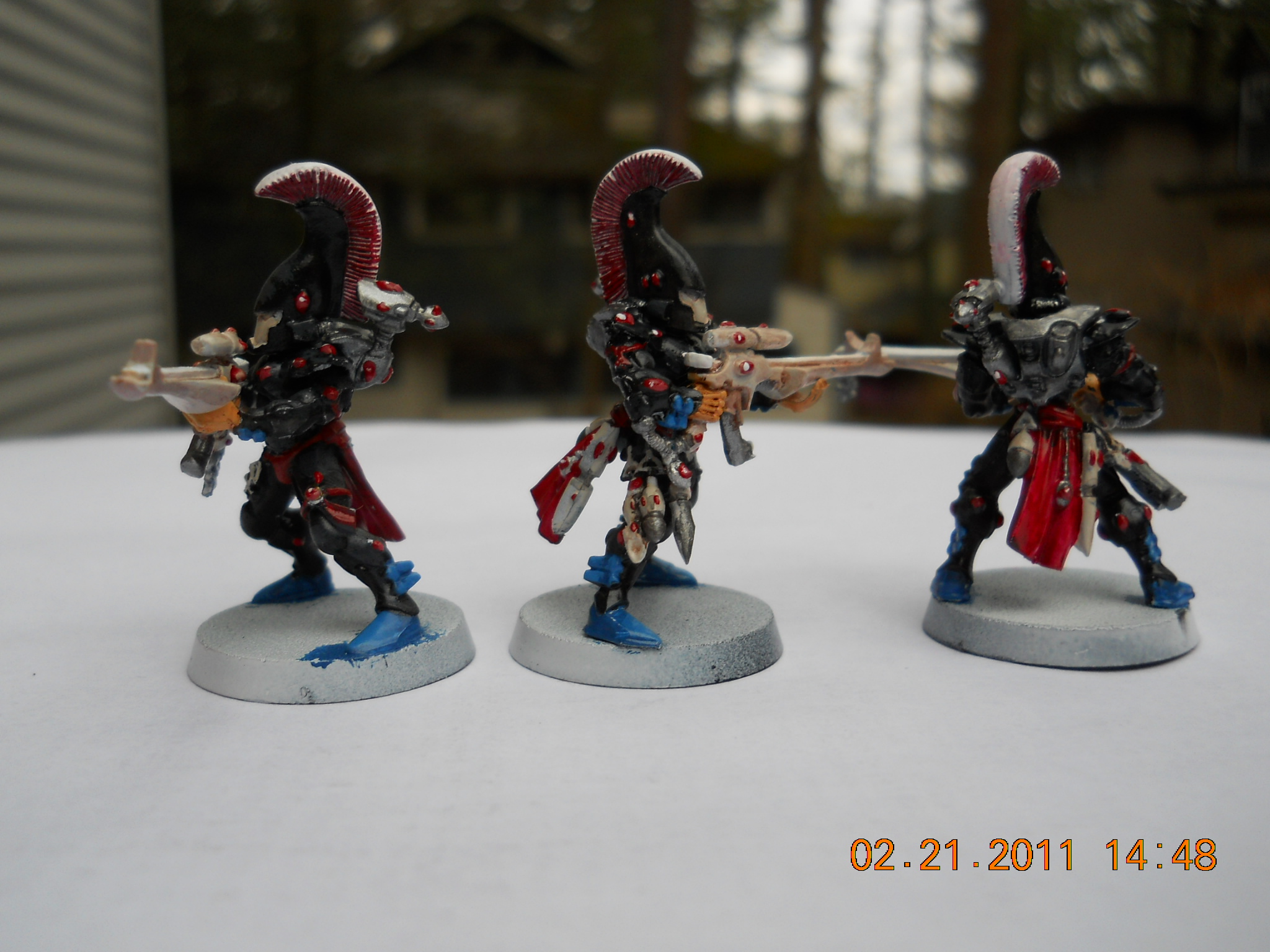 Hi, everybody. I've got a serious problem on my hands. I'd wanted to do all my models in Ulthwe colors, but wasn't terribly happy about the starkness of just having black and bone - and doing some research found out that dark red was an acceptable color to add to the palette. I've also done a little bit of blue on all of the models just to give them a bit of whimsy. I've included some examples below so that you can see what I'm talking about. Does this mean that I cannot call them Ulthwe any more? If so, I'll need to figure out how I can repaint ALL of the minis I've done thus far, which I really don't want to do. I've got a blog that I've been doing, titled "Beaker's Ulthwe Eldar Spot", and I don't think I can change the name of the blog. I need feedback from everyone as to what my options are here - whether I can call my minis my interpretation of Ulthwe, if I have to repaint all of my minis if they aren't, or if I need to come up with a different Craft World for them. I'd really hate to do this, as I've been using some of the Ulthwe decals as well. I've had one Eldar player tell me that I can't call them Ulthwe (he's in my gaming group), and I haven't had anyone comment on this on the gallery pics or on the blog. HELP!!!!!