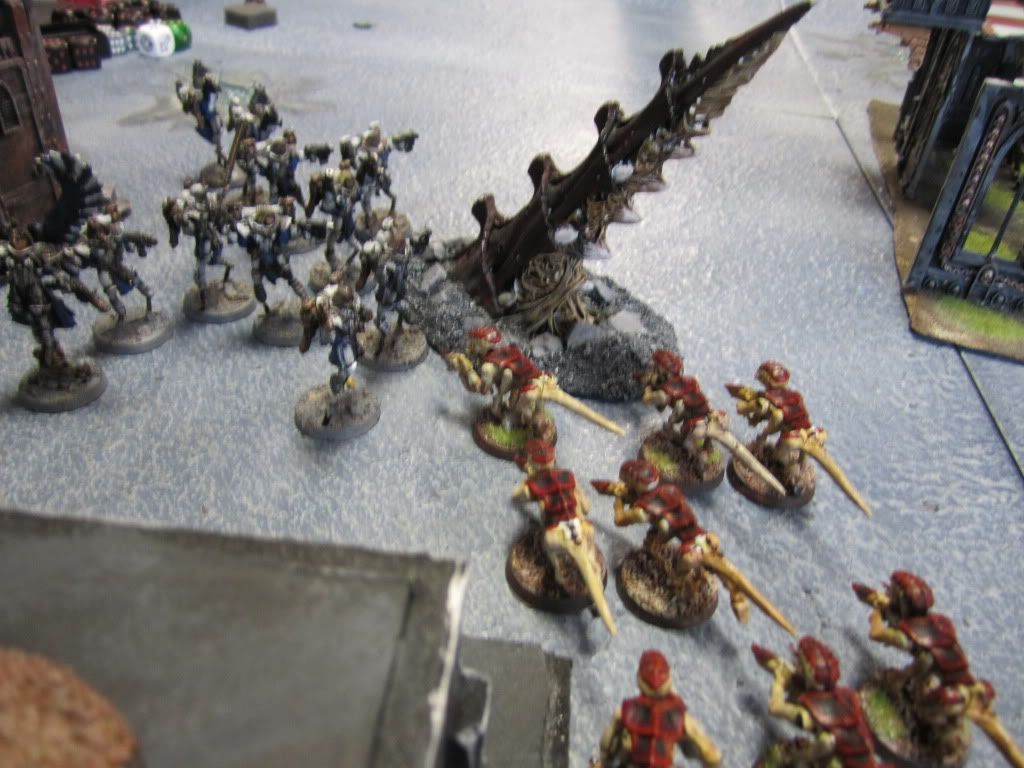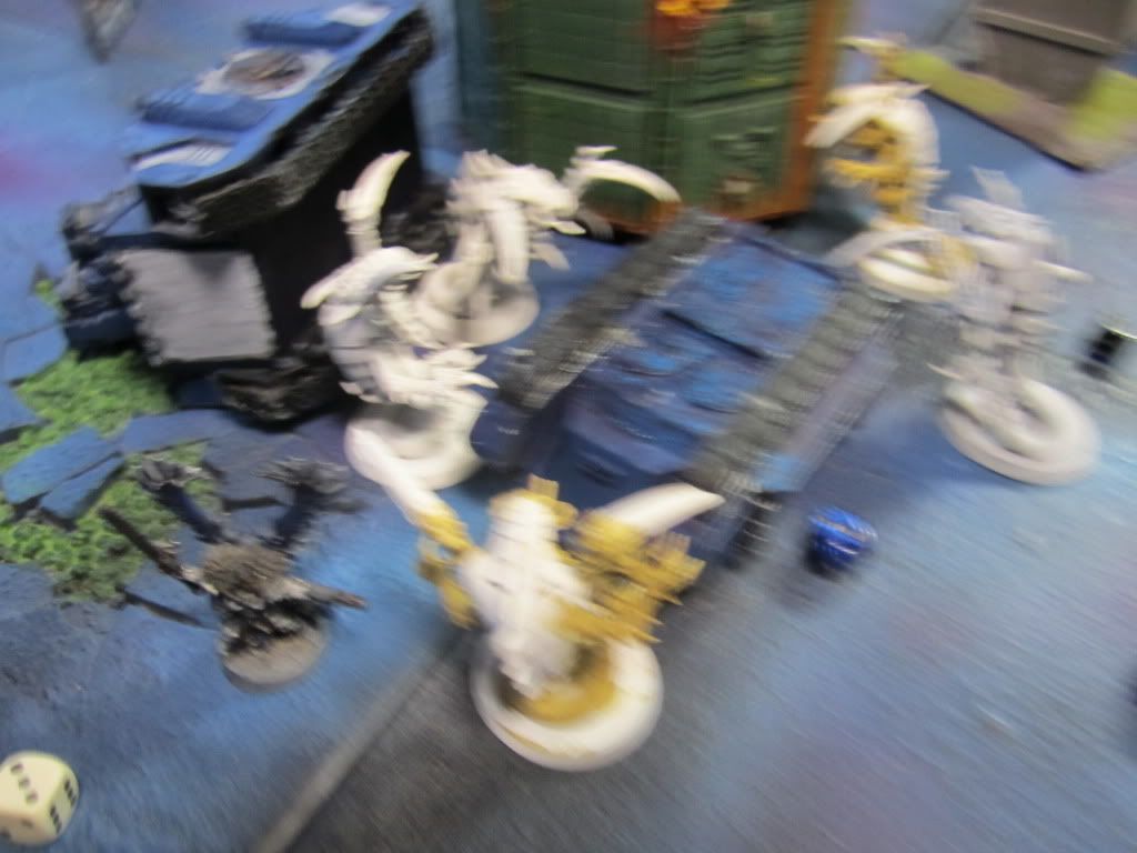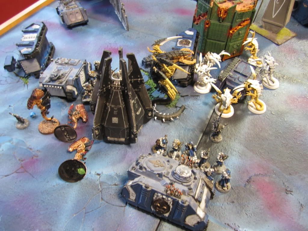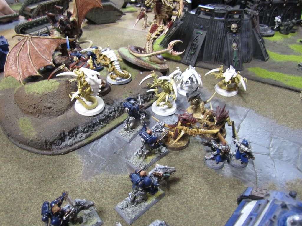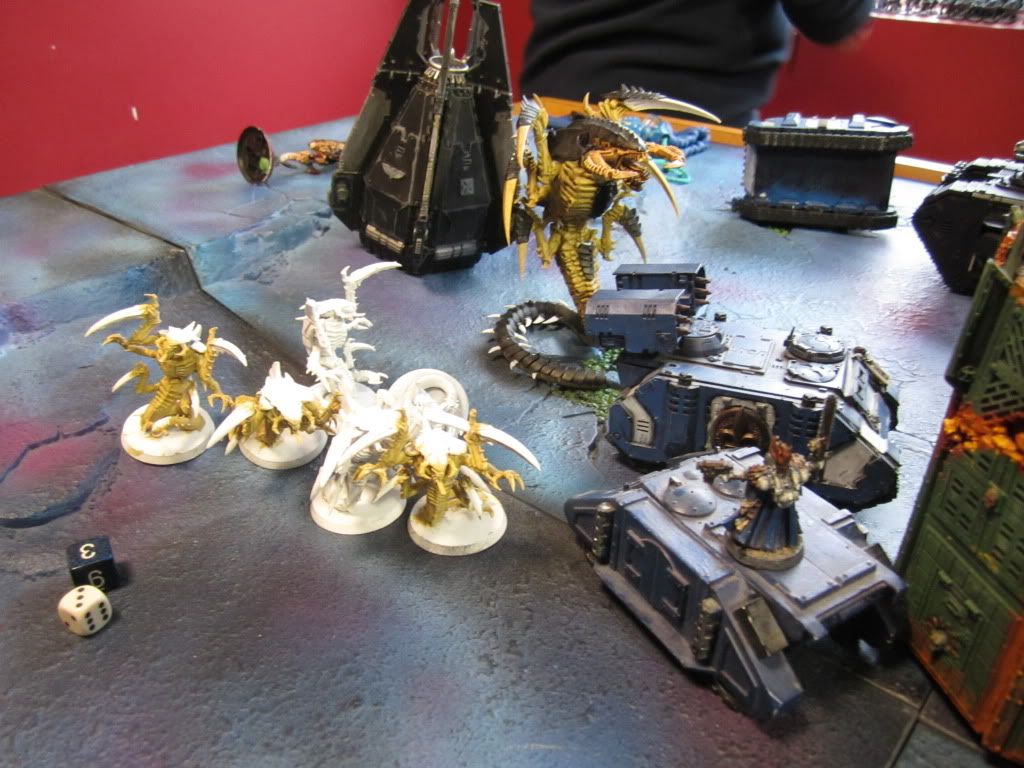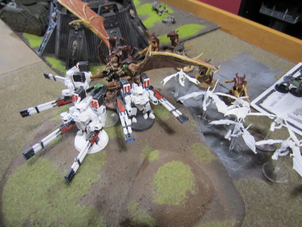 Shrieking, the Tyranids swooped down upon the Tau, the Hive Tyrant personally tearing the nearby Broadsides apart in a welter of gore.