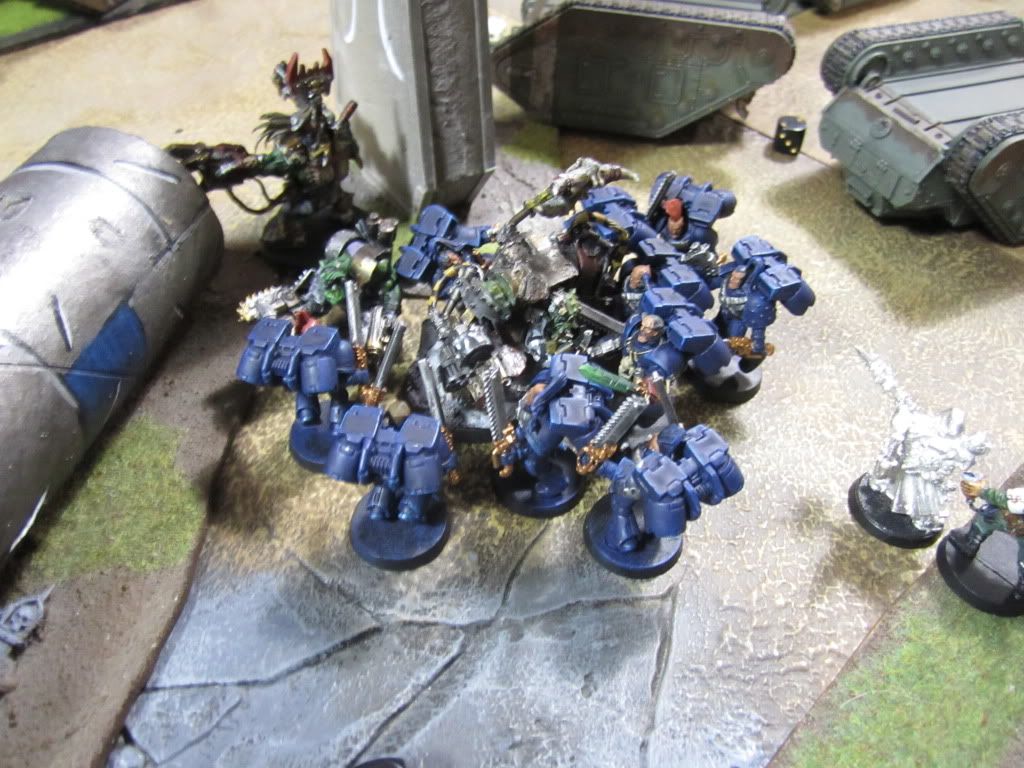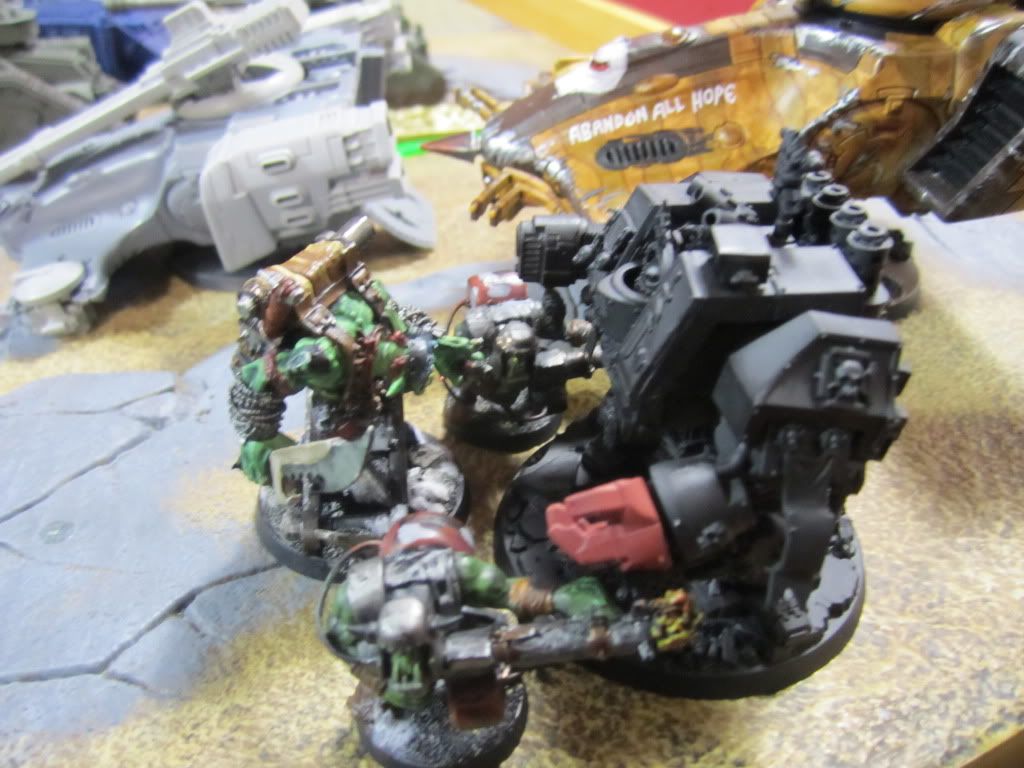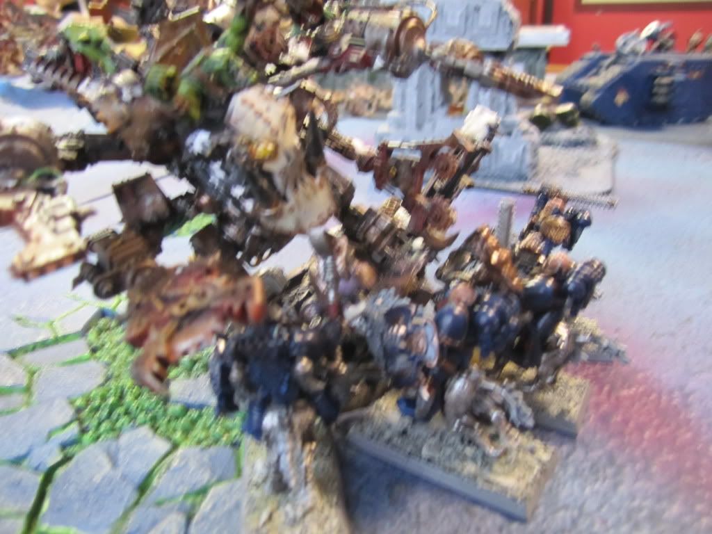 The Thunderwolves, meanwhile, charged the Megadread. For all of their skill, however, they could not damage the Ork contraption, and the fight dragged on.
