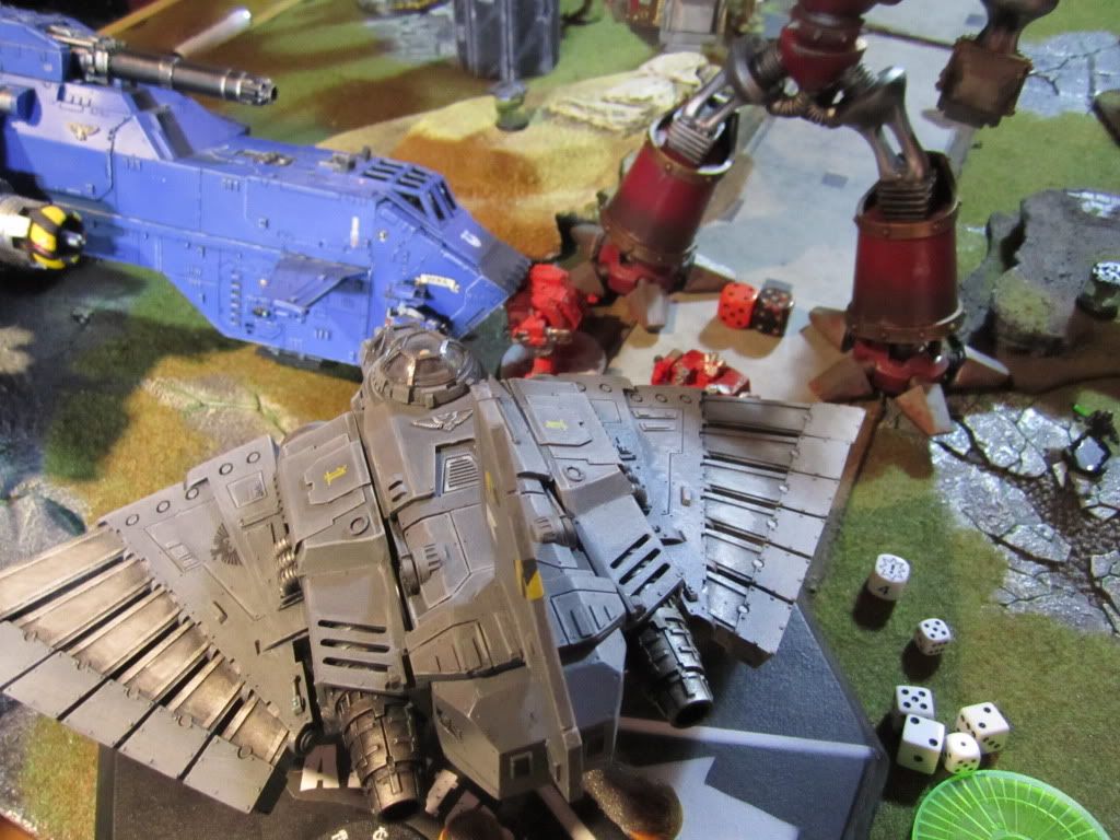 While the Deathwing launched their frontal assault, one of the Astartes Thunderhawks swooped down on the rear of the battlefield, raking enemy tank formations and the Reaver with heavy fire.