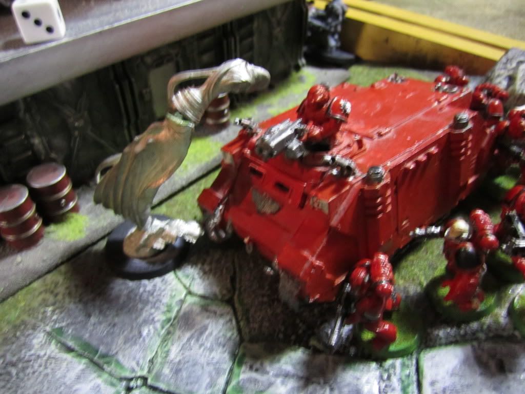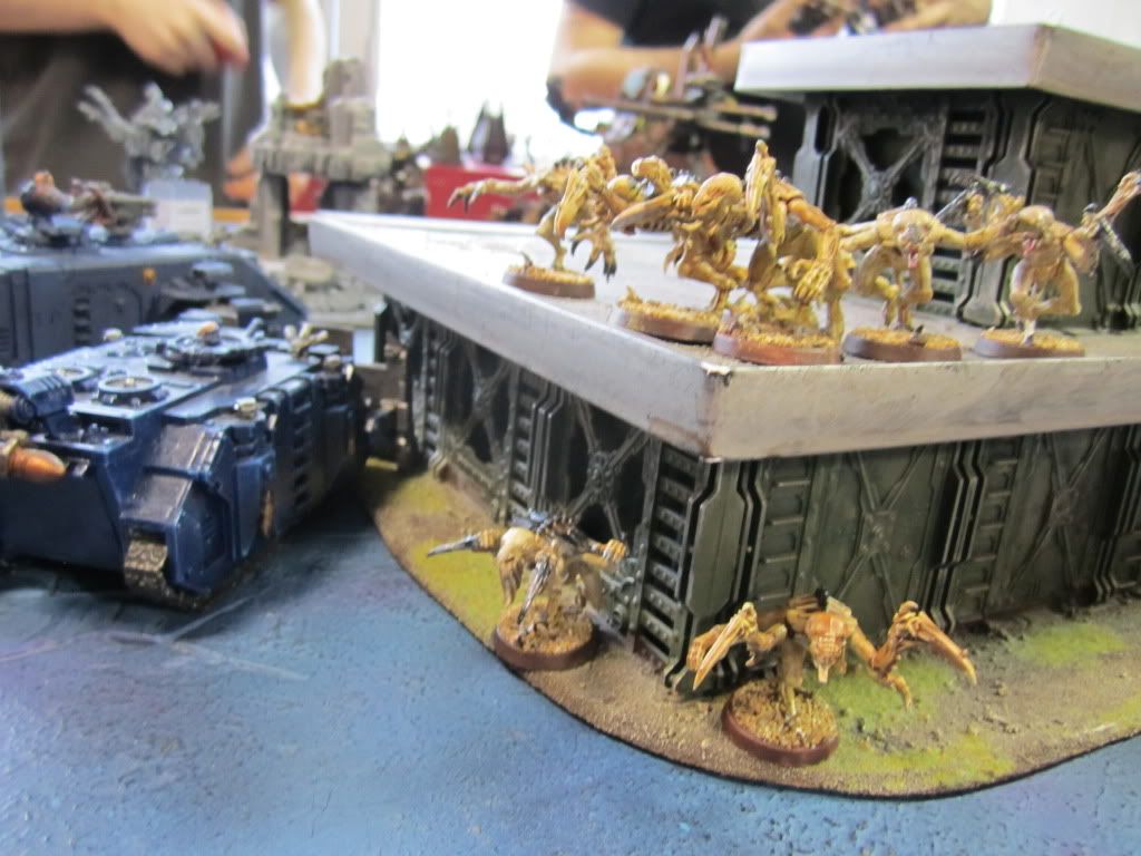 Hissing, the Raveners charged the nearby Rhino, surrounding it. With all of their escape routed blocked, the Canoness and her Celestian retinue were eaten alive as the Raveners tore their transport open.