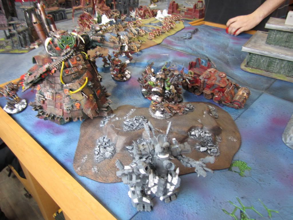 On the right flank, the Orks massed in a green tide, with a Stompa and a roaring Squiggoth towering above the Greenskins. A few Tyranid beasts stalked amongst the Greenskins as well.