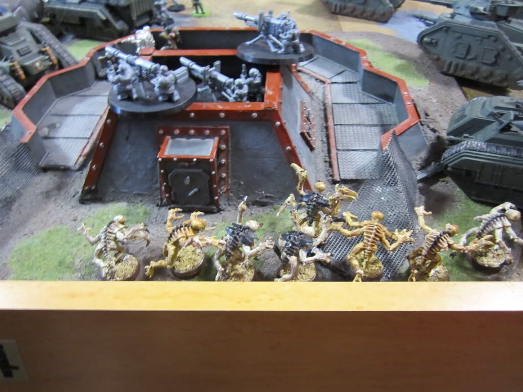As the battle raged, much enemy fire was directed against the Stormlord, inflicting many crippling blows upon the ancient tank. Finally, the Necron Lord who had escaped Belial flew in and carved the tank open with its crackling warscythe, reducing it to a smoking wreck in seconds.