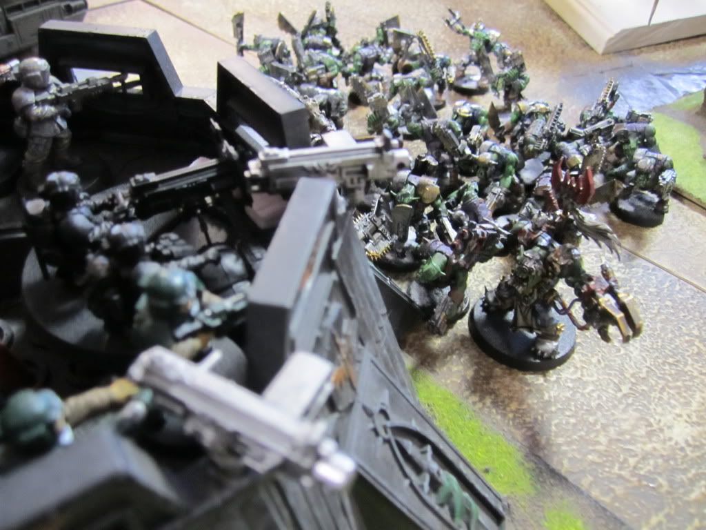ined buildings, the Cadians set up heavy weapon emplacements to rain fire on the Orks below.