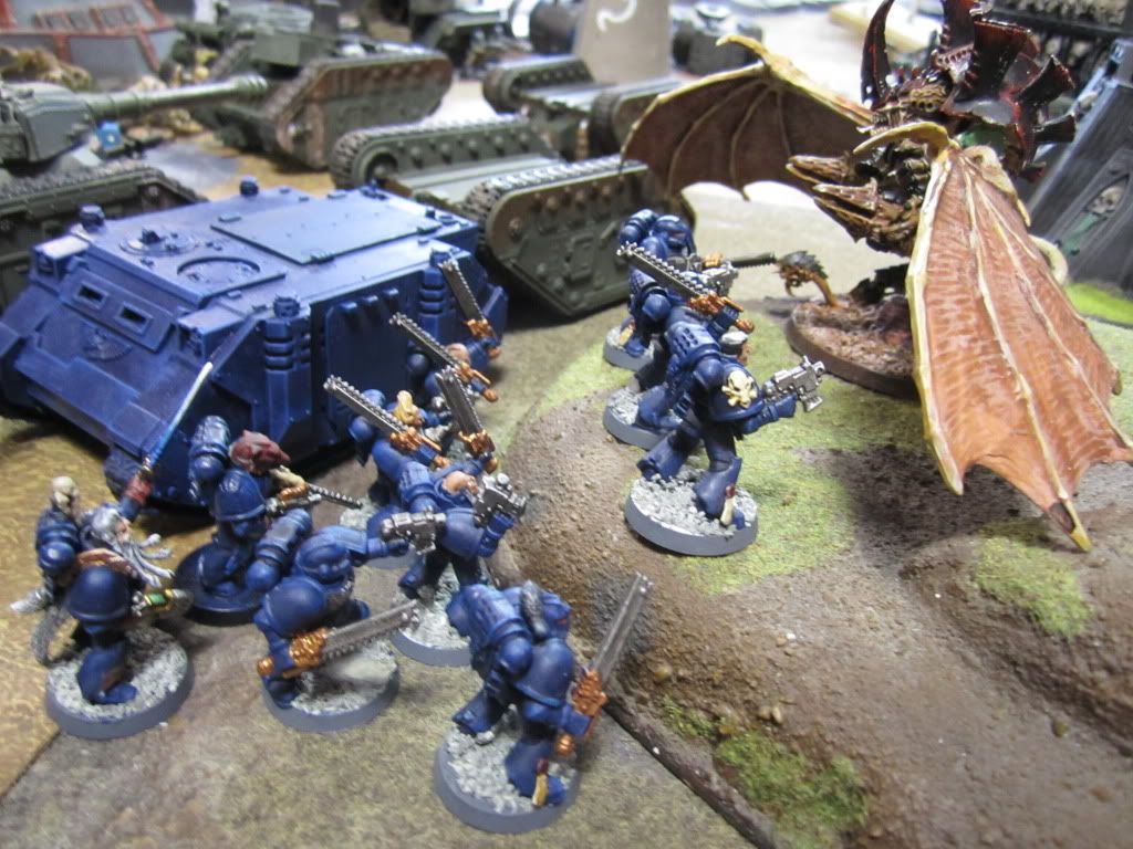 As the battle raged, a Stormraven of the Blood Angels chapter swooped in, unleashing the fury of the Death Company and one of their berserk Dreadnoughts upon the enemy tank line.