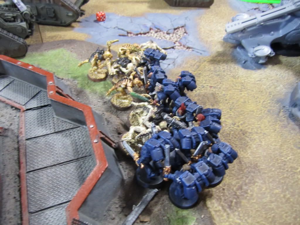 At that same moment, a brood of Ymgarl Genestealers burst from their hiding spot in the manufactoria, right next to the Space Wolf tanks. Before the Space Wolves could react, the Ymgarls charged both the Vindicator and the Predator, though thankfully they caused only superficial damage.