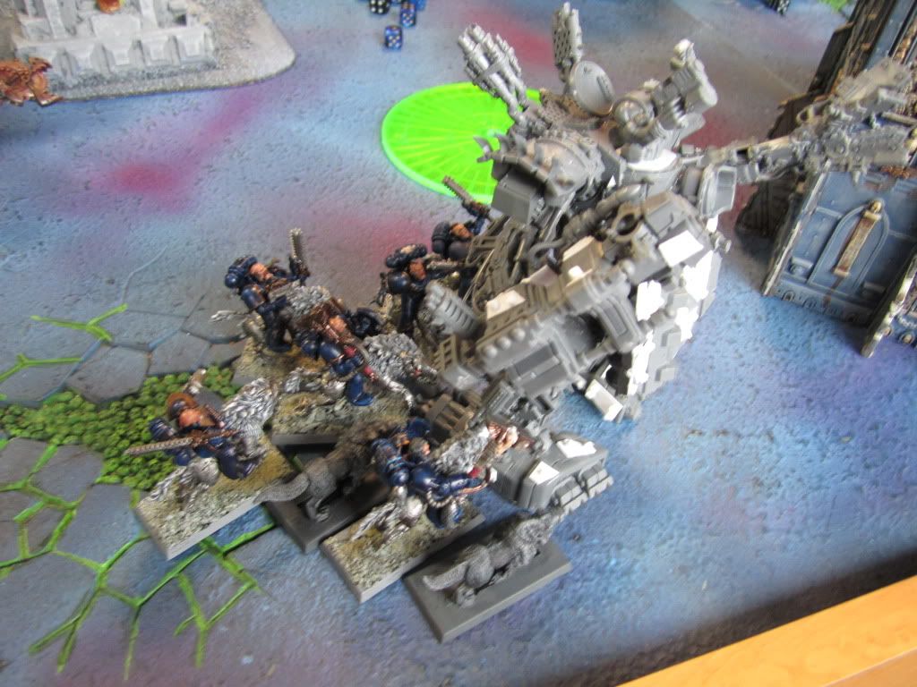 Manouvering into firing positions, the Space Wolves hammered the oncoming Orks, annihilating the Battlewagon in a fiery blaze. Logan and his Long Fangs fired into the unprotected rear of the Stompa, causing critical damage and dropping two structure points from the metal beast.