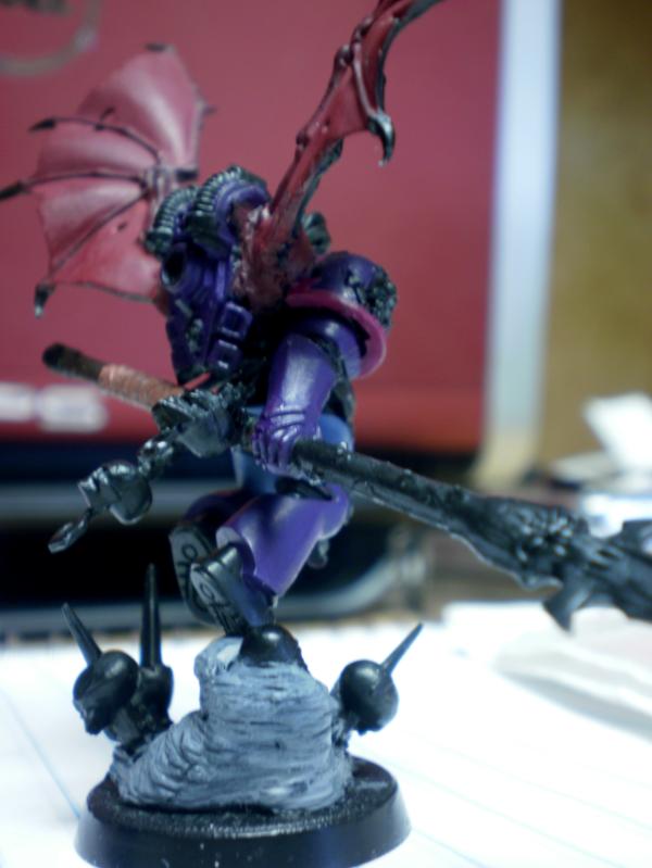 Alright, here's a small little update for you fellas. I went a little crazy painting last night, and finished up my winged Chaos Lord (except for his base)! I present to you Dorian the Blade, wielder of the daemon spear Khaer'Drakan!