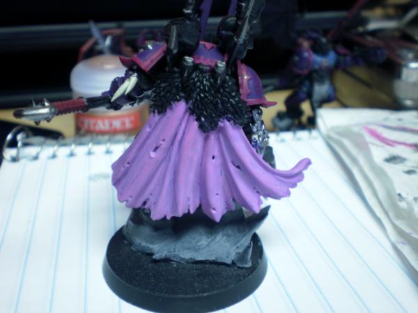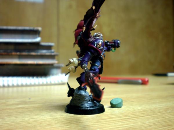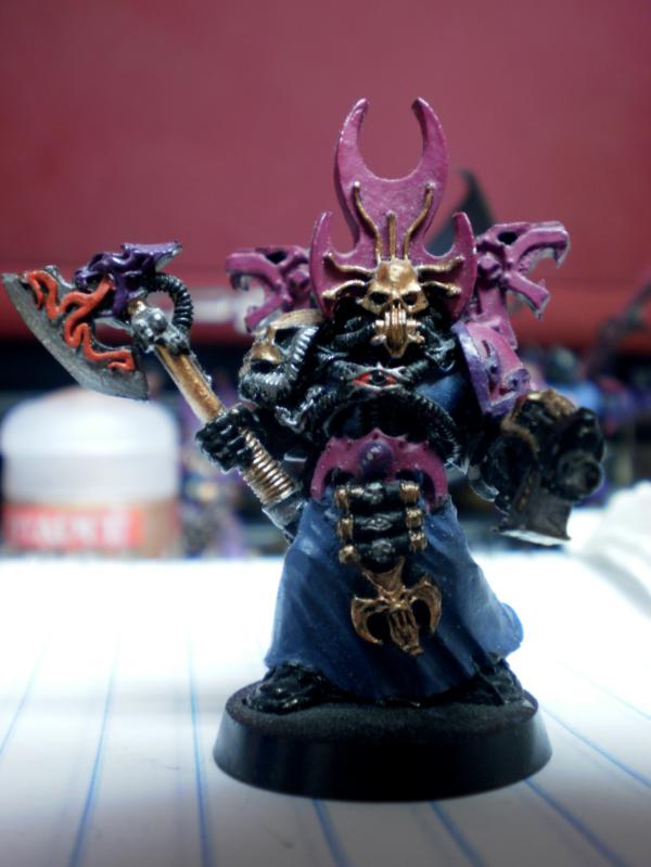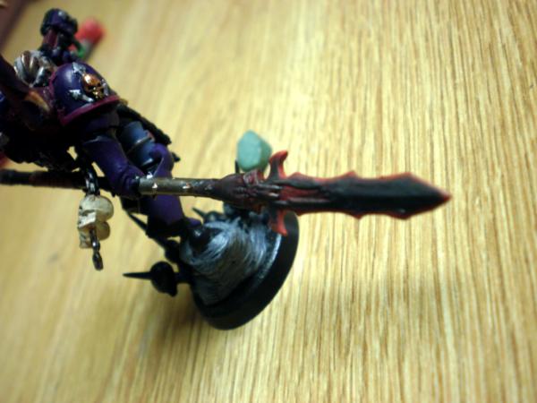 One thing that I'm not good at is faces. I know this, and it is true. The face on this model is no different, and I'm sure that it's not quite up to standards. However, I wanted to make him pasty and pale-looking, and I got that down, so I'm satisfied. I also like the corruption seeping from his eyes, as well as the blood running from his mouth. (The story is that he was once a Blood Angels captain who was tempted to Slaanesh's side by exploitation of The Red Thirst. Slaanesh taught him to revel in his urge to drink blood, rather than deny it as shameful. The rest, my friends, is history!)