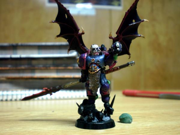 I'll have to give that a try for sure. I'm not very good at advanced painting, yet, and fur seems to be particularly challenging for me. I'll give it a go, though. Automatically Appended Next Post: Brand new update! I've been unusually busy today, and I finished my half-done Chaos Lord, for the most part. All that's left to do is wait for the wings to cure so that I can scrape off the unnecessary blob of greenstuff holding them on and replace it with some (hopefully) natural-looking webbing, to make it look as if the wings are growing out of the Chaos Lord's back. Any comments?