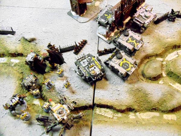 CC dred charges into combat to help the now solo chaos lord. Predator fires blowing up looted wagon. Vindicator kills ten orks from the only unengaged ork mob. The unengaged