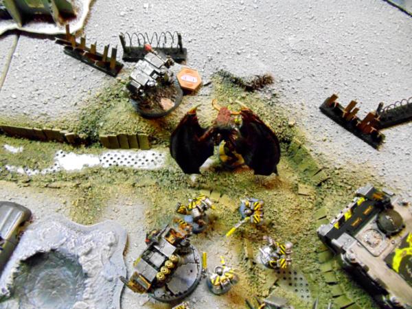 Assaults see the lord and his raptors beaten in combat. Result: the raptors die to fearless saves and the lord takes a wound. The dread wins in the building by 3 losing another 3 to fearless saves. Orks on the right side kill two marines losing 4 orks.