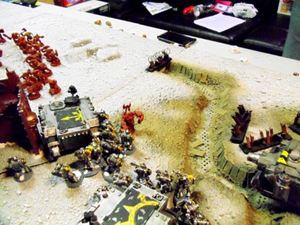 On turn 4. The defiler moves up and fleets to support the assault in the building. The