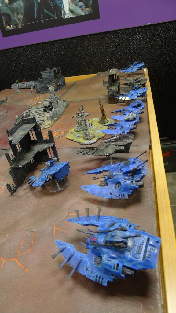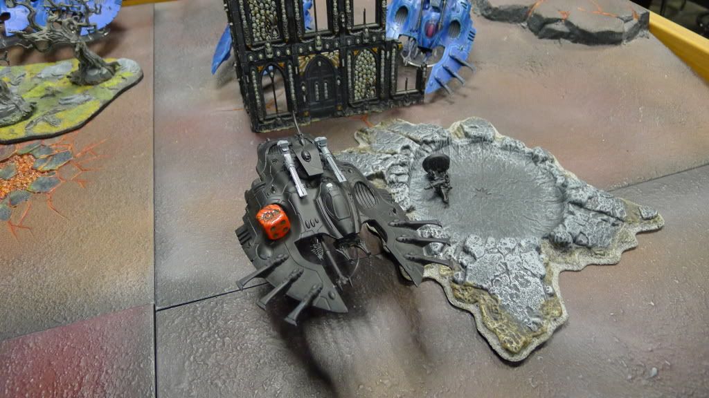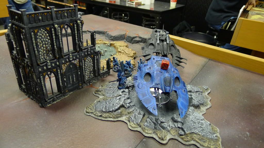 I concentrate my dreads on this right skimmers in cover. I blow up the dire avenger wave serpent, killing 3 avengers in the process. I also take out the prism cannon from his fire prism as well as shake it. Finally, I kill off his pinned fire dragon.