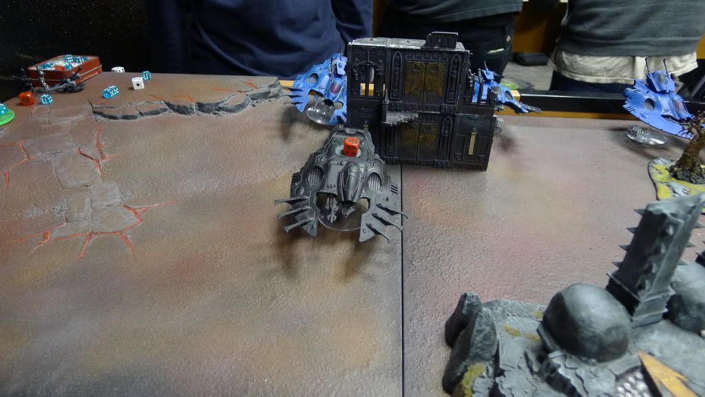 My right purgation unit goes after his fire dragons. My left purgation unit disembarks and go after his dire avengers (the razorback then pops smoke). My right chimera immobilises itself on terrain, so its plasma passengers disembark to go after the weaponless fire prism (which rammed my dread last turn). My regrouped unit of 2 meltagunners also go after the same prism. Everything else advances.