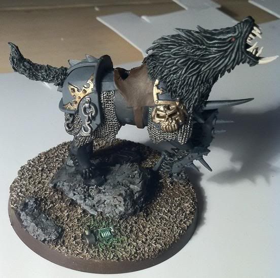 Seems pretty acceptable. But personally I'd work on reducing the horsey look a little, e.g replace the mouth or whole head, and it might be possible to shorten the legs into a more wolfy posture. And swap some of those chaos/spikey bits for SW icons etc.