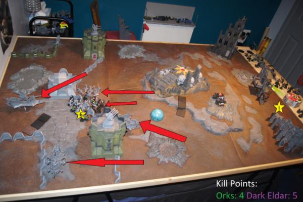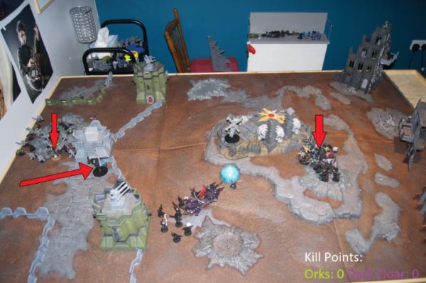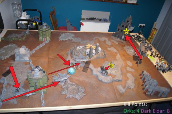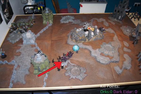 -Both of my Ravagers move behind the temple of skulls to try and hide from the Loota's, Trying to keep a clear