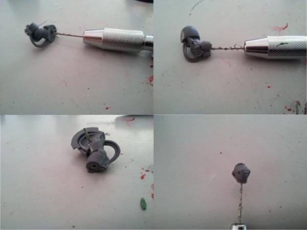 3) Drill the arms like shown in the picture, supergle another pin into the shoulders, just like you did for the phase 1; also drill a deep hole into the wrists and the head
