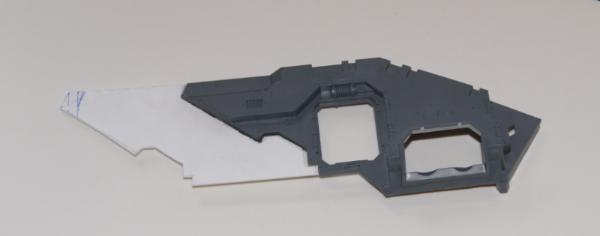 The extension of the vessel's fusilage looks very nice. I'm hopeful you maintain the 'depth' changes in the side profile of the vehicle as marines seem to use stacked metal bulk in many of the vehicles. I like the integration of the various stock amror plates and grates into the plasticard extension. Looks like you nailed that bit, hats off.