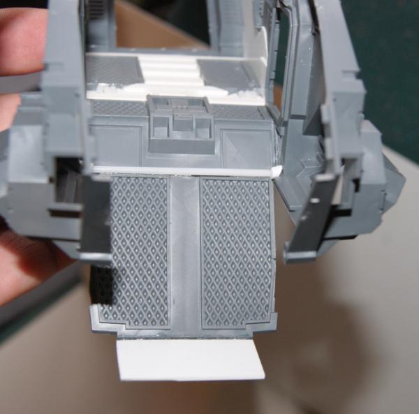 The plasticard has been attached because the turret won't block the whole front ramp and because the marines need some room to get out. Now, a terminator could easily use the door.