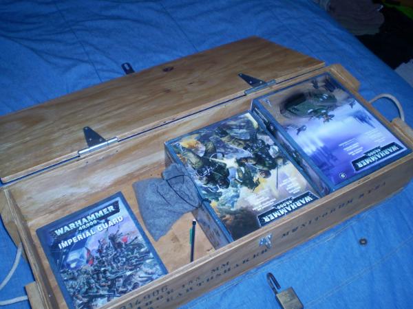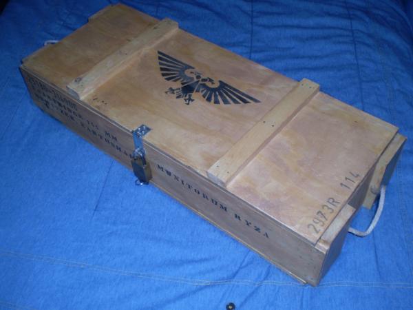 Recently I took it upon myself to try my hand at carpentry. I have one of those old artillery shell crates around, and I decided to try and make a modified copy for storing my IG. In retrospect, maybe I should have taken some wip shots, I hadn't thought of it at the time. The box holds up to eight 15x12 inch battlefoam trays (or several IG vehicle boxes, interestingly). The stenciling is a bit shakey becasue I've never tried my hand at that, either.