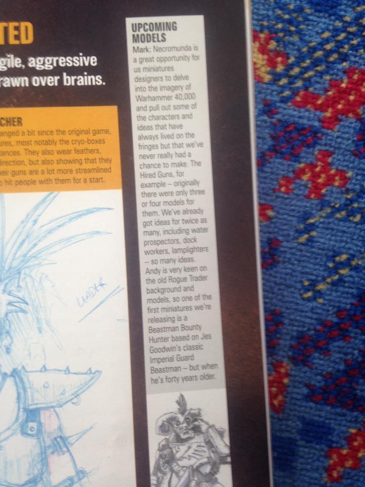 Good lord! This gets better and better. Beastmen returning? More hired guns! If they're getting ideas from Rogue Trader, then the hoverbike race and "Smash the Empire" graffiti stick out in my mind Now, who wants to petition GW to do a Squat style hired gun
