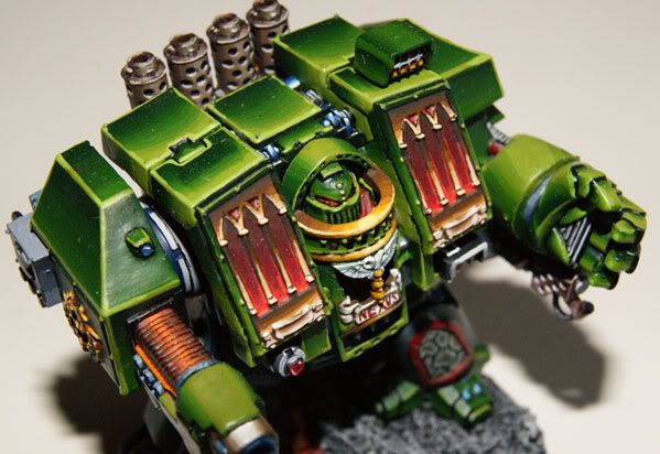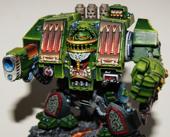 The front torso plate was cut through in a neat way to show the marine power armour torso underneath. That was done in a red colour to add a story to the dreadnought (its occupant was a techmarine).