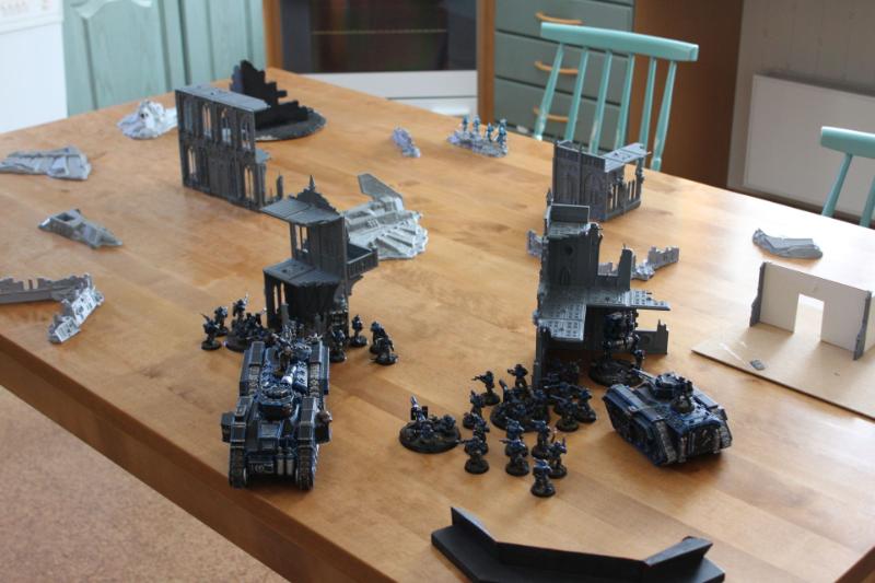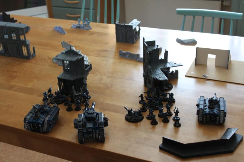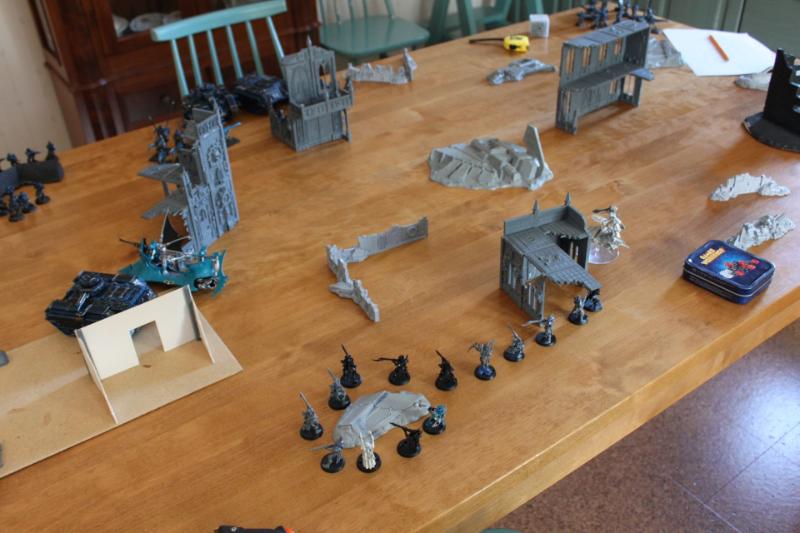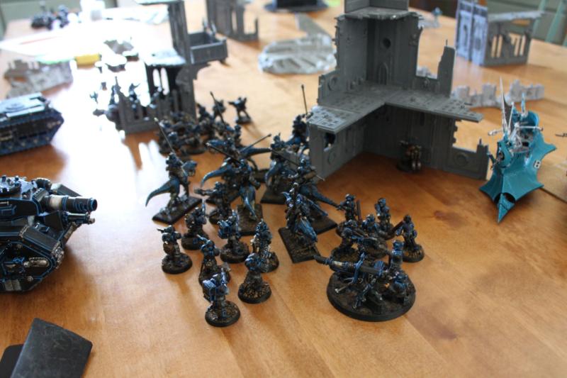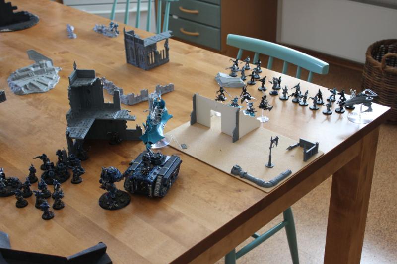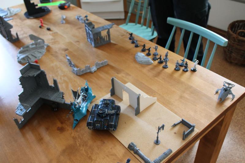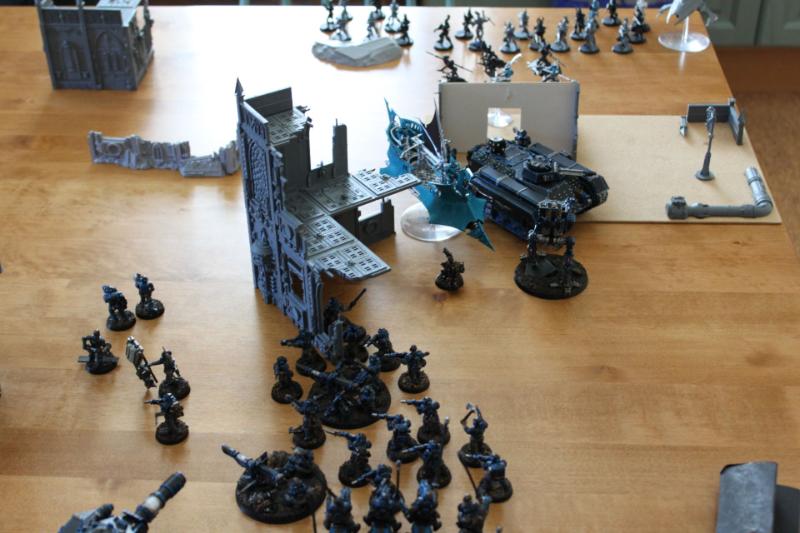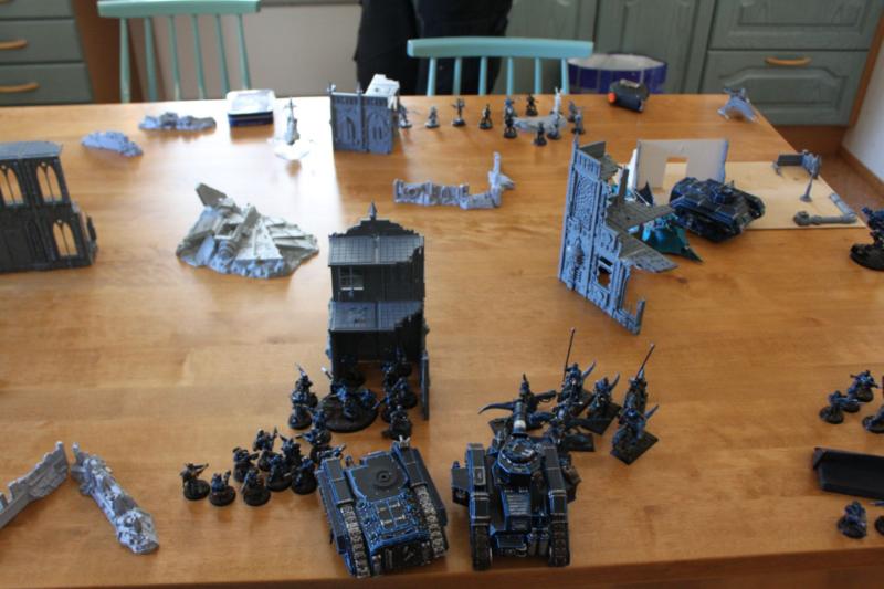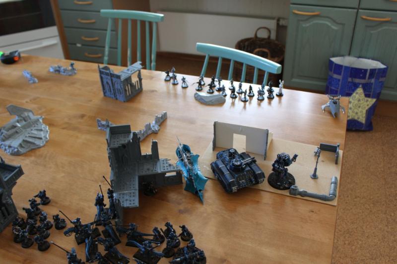 Tactical assessment: I decided to deploy very carefully because I've had rough games against his dark eldar before. I left my opponent with the corner with the least terrain so I knew very well where he would deploy his fragile vehicles. Just as I was about to complete my deployment, a sudden thought came into my mind and I realised that the best tactic for him was to leave everything in reserve because the kitchen table was kind of small. And so I concentrated my force better and tried to protect my vulnerable guardsmen from table edge charges or something like that. I put my