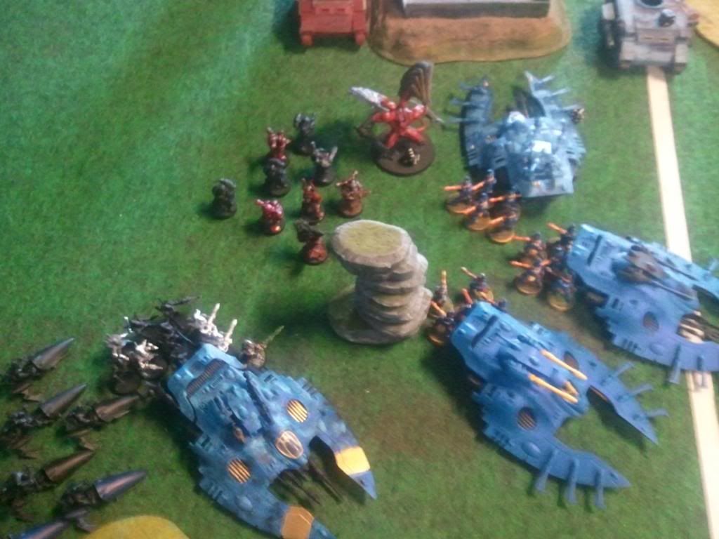 Im able to destroy the defiler on my left in close combat. My middle objective is held by troops and a wraithlord that whiped all units off.