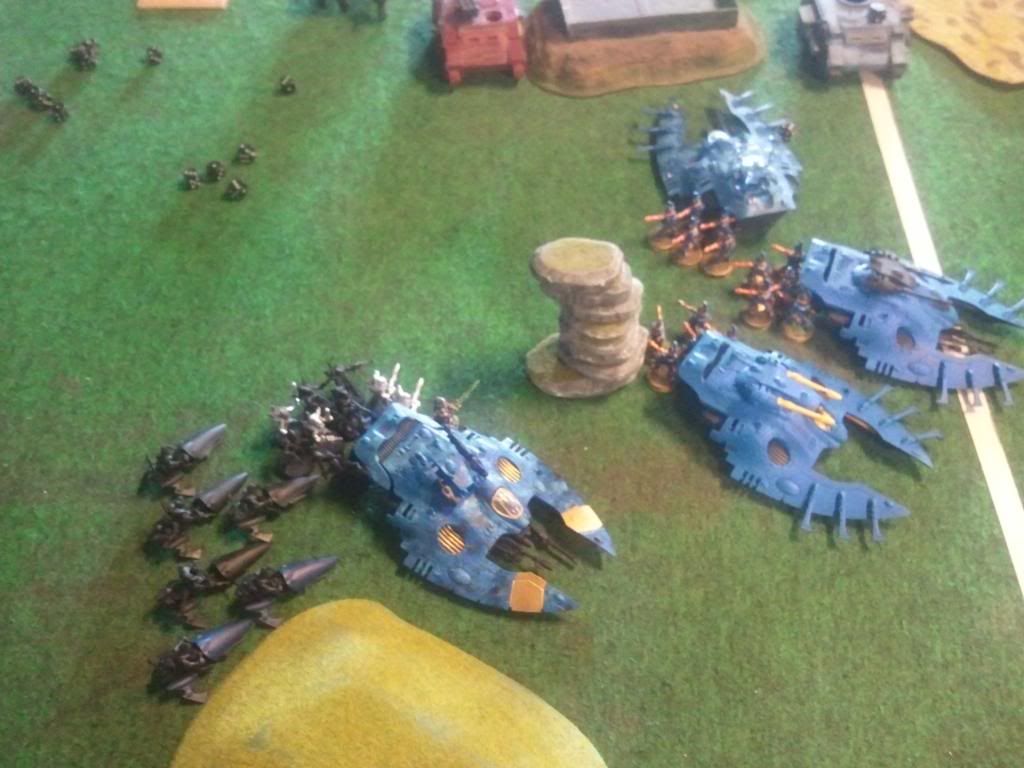 I move my wraithlords up and take the middle objective, I also whipe out a squad to my middle. 10 Firedragons get into Close Combat with the Defiler on the left, while 5 other fire dragons destroy the last rhino in the middle Pinning the squad inside. I shoot and kill a few marines.