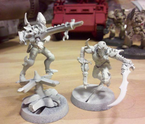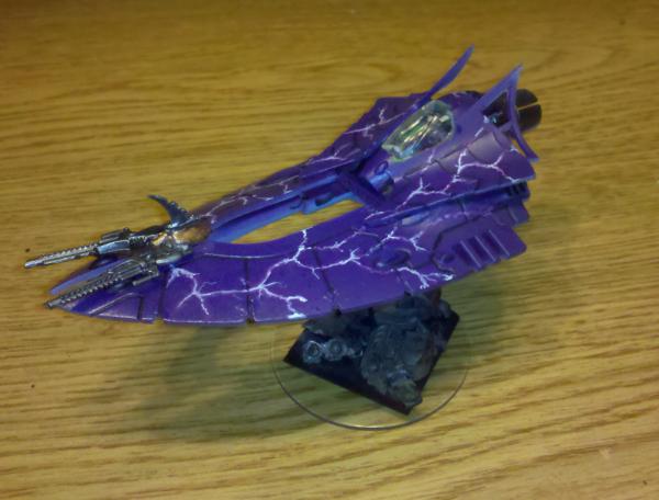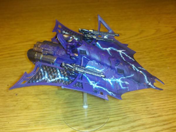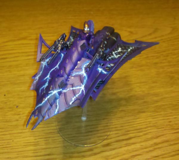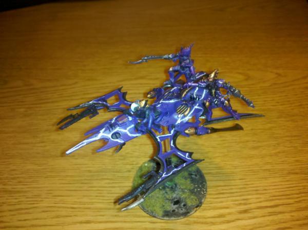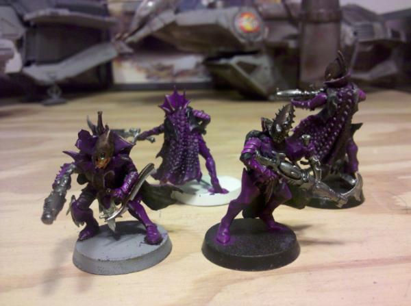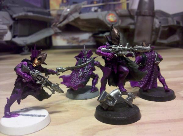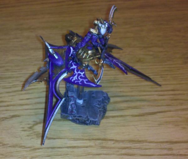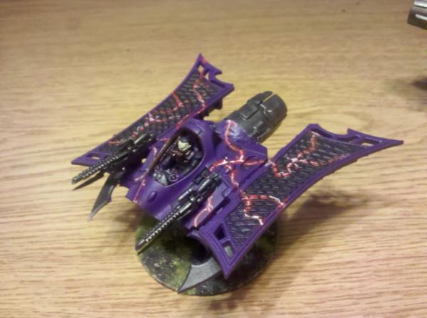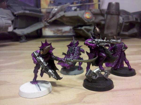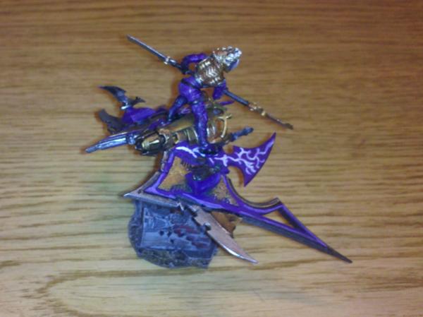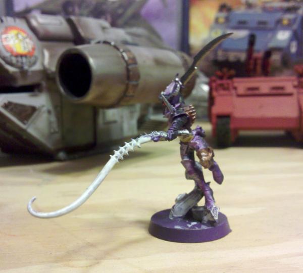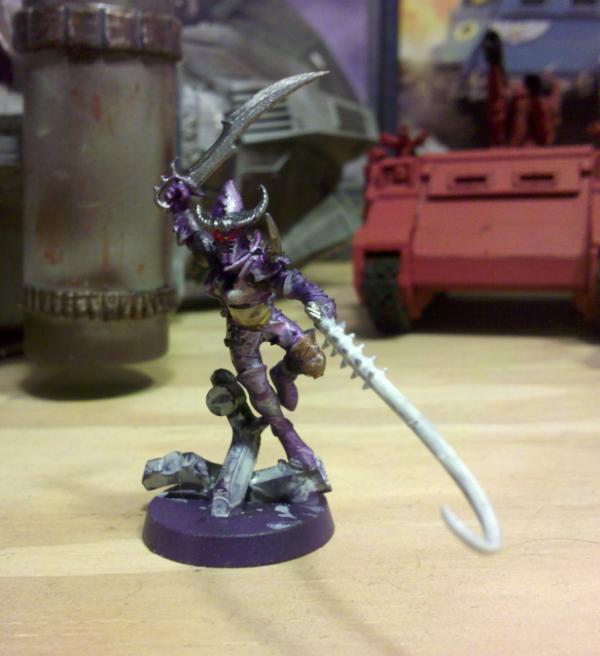 HQ choice is Baron Sathonyx. Naturally, there is no specific mini for him, and so I took a hellion, played around with the posing, and built up the skyboard. Bigger. More blade-y. I also used the faceless helmet from my Reavers. I love that look. If I could get my hands on enough of the bits, I'd do the entire Kabal that way. A good friend of mine took the model away from me when I got done building it, and painted it for me. That pretty much set the feel for the paint and armor scheme for the rest of the Realspace Raiding force.