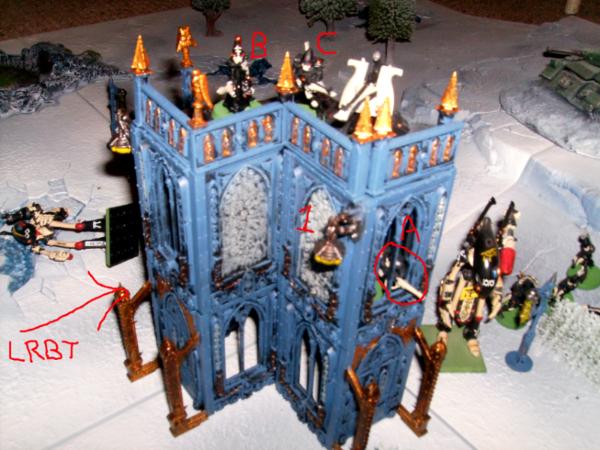 In the example below, models A,B and C are part of the same unit. there is a Leman Russ battle tank off camera firing from the direction of the arrow. I have moved model A to the window so you can see him but he was infact where the number 1 was well hidden in the buidling.