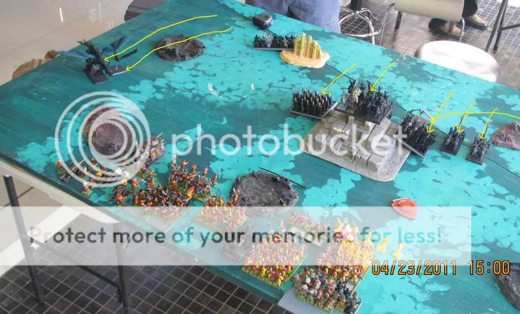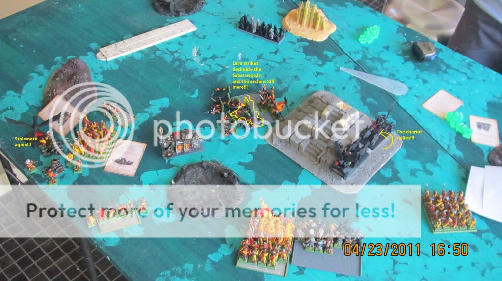 The volcano comes to life, as 2 pistoliers fall to lava, before the Dragon princes charge into them, escaping the Net of Amyntok. The other units attempt to charge the screens, who flee (with some archers falling in the misty marshes), and thus end up with failed charges. The wounded great eagle manages to charge into the great cannon though.