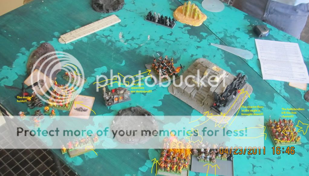 WA and Halberdiers then wipe out the spearelves, and the nearby Lion chariot panics and flees, as the elven center crumbles....The Eagle kills 2 crewmen, but gets wounded in return, and the mortar continues to hold.