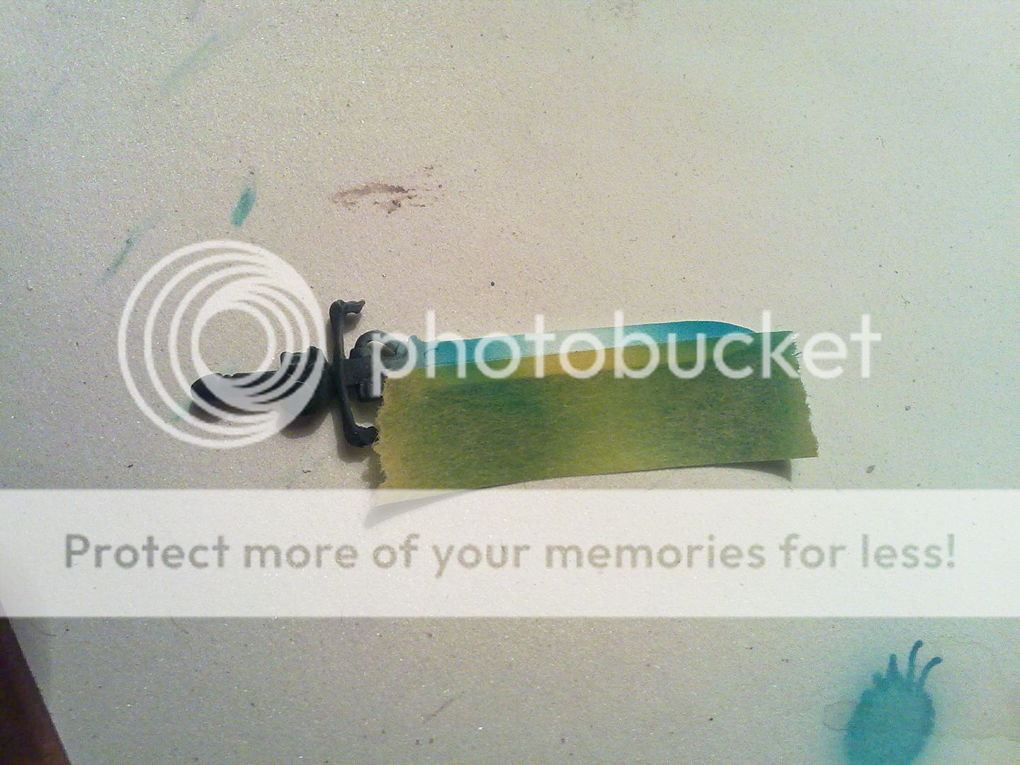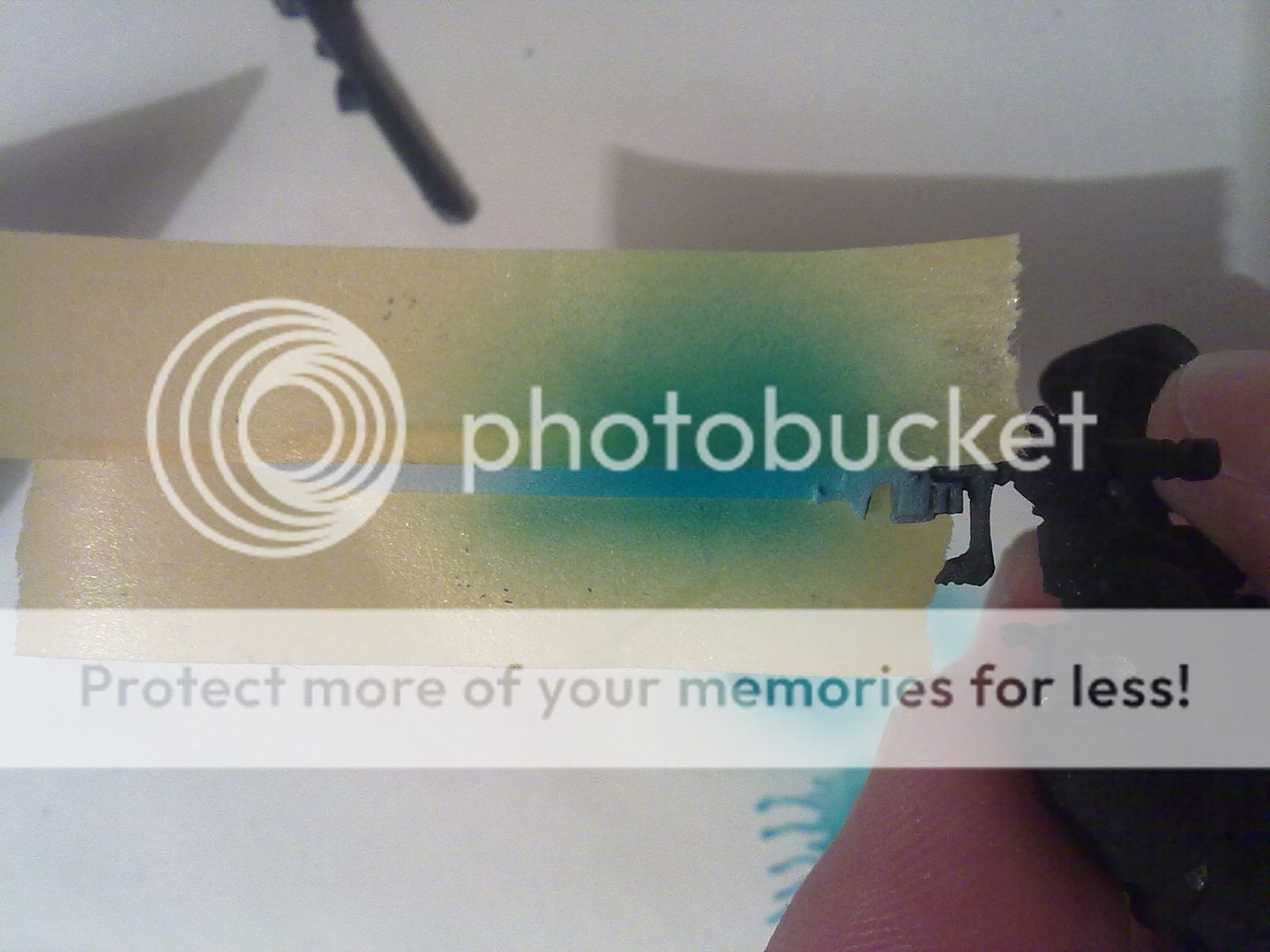 7.Now mask the painted sides, leaving the white ones exposed. Instead of doing two Hawk turquoise you only paint one in the centre of the blade. This makes the colours mirrored on th two halves.
